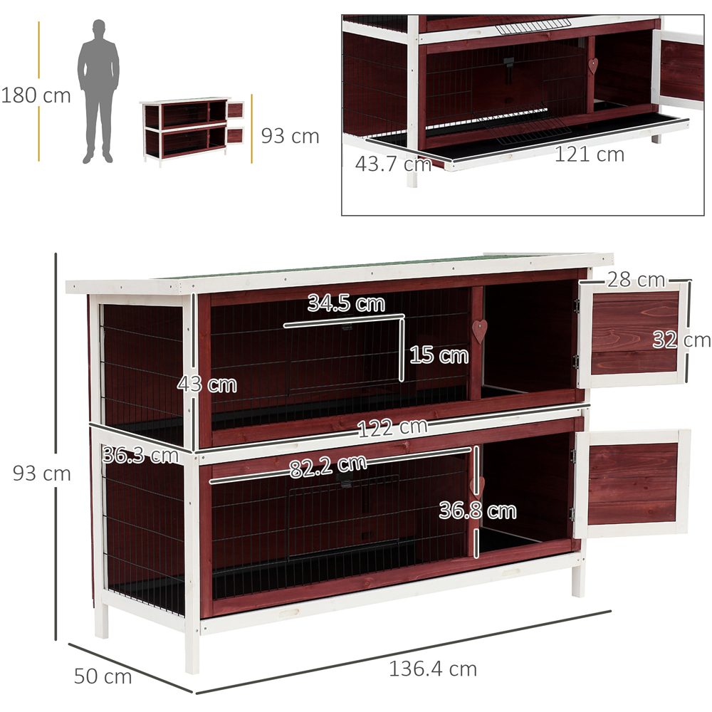 Give your pets a spacious and comfortable home with the PawHut 2 Tier Wooden Rabbit Hutch with Slide-Out Trays and Open Roof. Your furry friends can easily move around inside the two tiers. The metal fence and the fir wood construction keep the enclosure well-ventilated. The pull-out trays make it easy to clean. Please note: Rabbits need regular and frequent opportunities to exercise. Make sure your rabbits have opportunities to exercise every day to stay fit and healthy. Rabbits are most active in the early morning, late afternoon, and overnight, so every effort should be made to ensure rabbits have access to a large area to exercise at these times. The hutch provides shelter, while rabbits should additionally be provided with a large living enclosure.