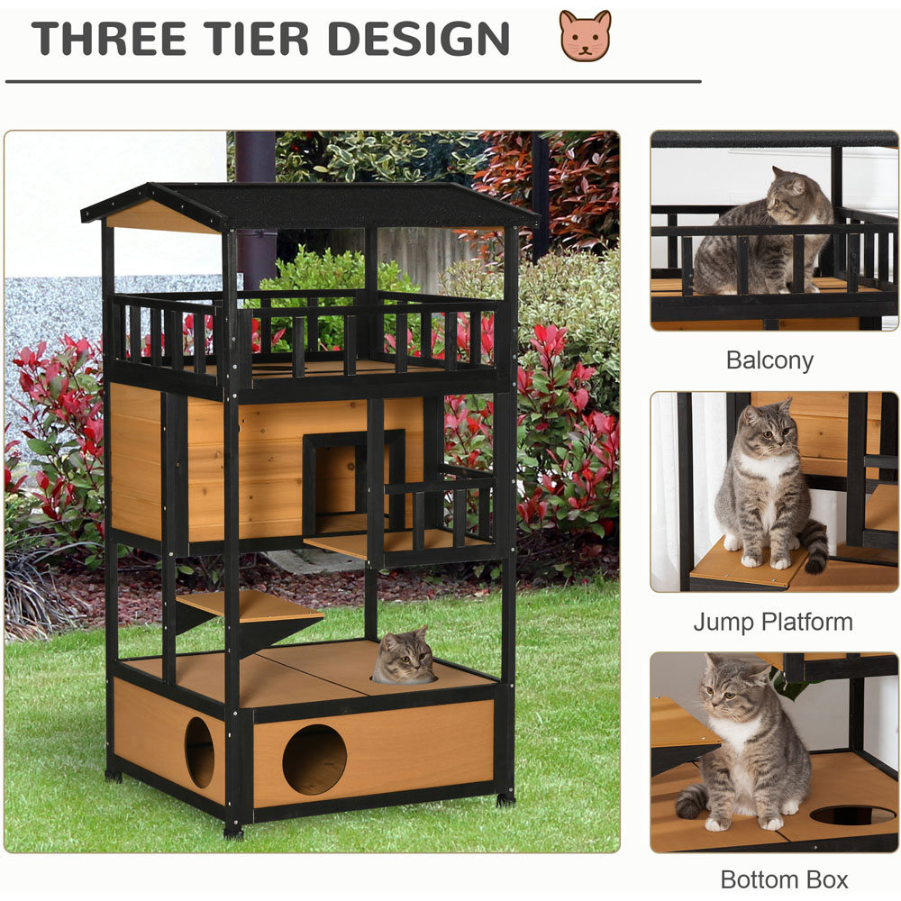 Treat your cat to something they'll love for years to come with this PawHut 3-Tier Grey Wooden Outdoor Cat House with Roof. Made from solid wood, this cat house is a strong and reliable option. It is crafted into a three-tier design, featuring a bottom hideaway hole with three round entrances, a bottom platform with a jump step in between the third platform, which features a house and balcony and a top open platform with a balcony. Also, it provides cats with plenty of room to explore, rest and cause mischief. Finished in a stylish yellow and black finish, the cat house can withstand mild weather - perfect for outdoors. Moreover, the asphalt roof lets the water roll off to prevent it from leaking.