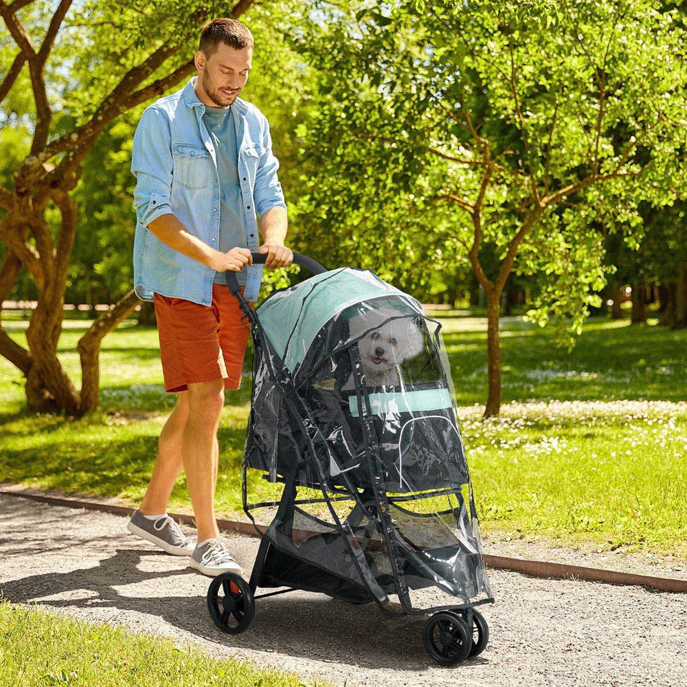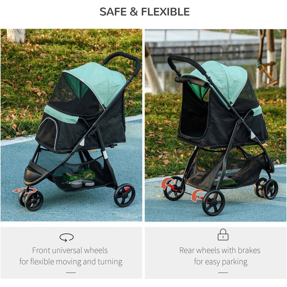 Enjoy outdoor adventures with your pet with the PawHut 3 Wheel Pet Stroller with Rain Cover Green. Made from a stable and secure steel structure, this pushchair is designed for safety and comfort. The stroller features plenty of room for pets to relax and is protected with an adjustable three-level overhead canopy. It is equipped with mesh windows for ventilation and zipped doors for easy access. Plus, the two leashes keep pets securely inside. The rear wheels have brakes and shock-absorption hardware for extra safety. The front wheel swivels 360° for smooth movement, making it effortless to push this pet stroller. The bottom basket and zipped pouch are ideal for taking essentials on the go, whilst the rain cover prepares you for unpredictable weather. Ensure your pet's joy and security on every outing, making every travel adventurous. The frame is foldable and lightweight, making it easy to store and carry. The stroller is ideal for cats and small and extra-small dogs.