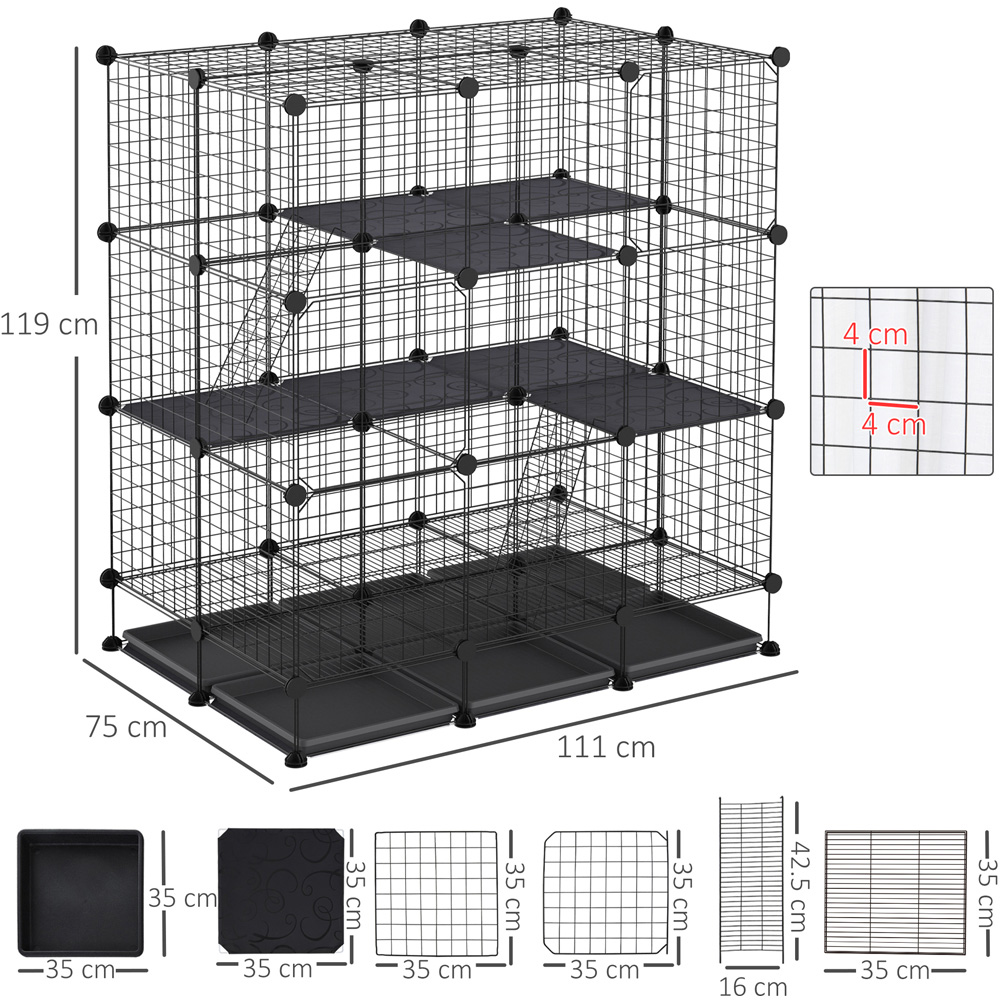 Put yourself in control of your pet's home space with this Expandable C and C Pet Cage from PawHut. The 30-piece set includes 26 walls, corner connectors and four large doors, the largest size it can reach is 119 x 111 cm, perfect for housing small pets. It allows you to set it to any shape and expand it if needed. Additionally, it can also be paired with multiple sets if you want it larger. It comes with six individual trays for the bottom to collect any dirt and waste, making cleaning extremely easy. Each wire panel is made from steel for safety, with large gaps allowing fresh air to flow through so your pet can breathe healthily. While the plastic corner connectors make it a safer structure. Note: Not suitable for hamsters and rats.