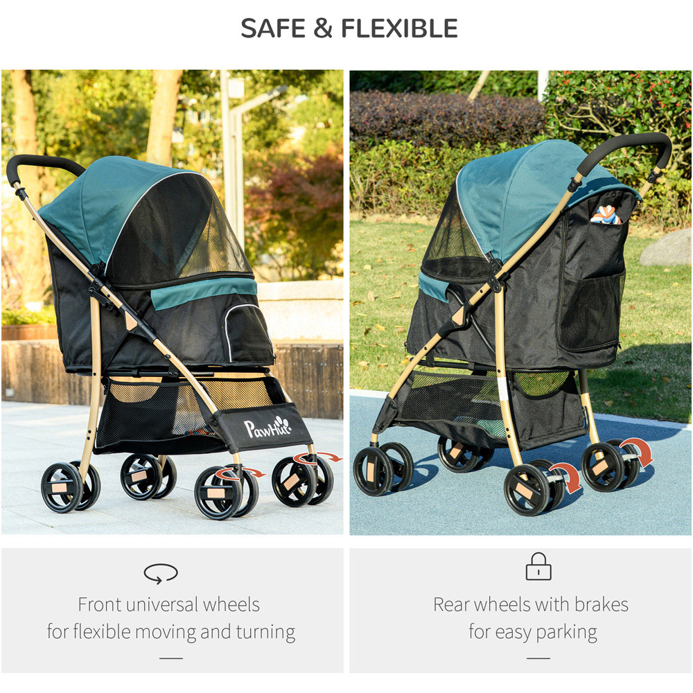 Enjoy outdoor adventures with your pet with the PawHut 4 Wheel Pet Stroller with Rain Cover Dark Green. Made from a stable and secure steel structure, this pushchair is designed for safety and comfort. The stroller features plenty of room for pets to relax and is protected with an adjustable three-level overhead canopy. It is equipped with mesh windows for ventilation and zipped doors for easy access. Plus, the two leashes keep pets securely inside. The rear wheels have brakes and shock-absorption hardware for extra safety. The front wheel swivels 360° for smooth movement, making it effortless to push this pet stroller. The bottom basket and zipped pouch are ideal for taking essentials on the go, whilst the rain cover prepares you for unpredictable weather. Ensure your pet's joy and security on every outing, making every travel adventurous. The frame is foldable and lightweight, making it easy to store and carry. The stroller is ideal for small and extra-small dogs.