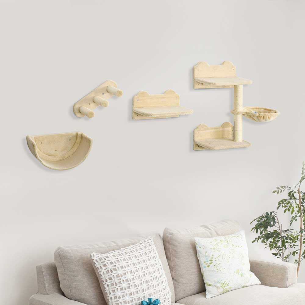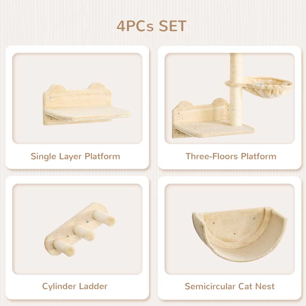 The PawHut 4 Piece Beige Wall Mounted Cat Tree offers a fantastic solution for pet owners who want to provide their cats with elevated spots to play, rest, and observe. This cat climbing wall features a hammock and cat nest for comfortable resting and sleeping, as well as a scratching post to keep their claws sharp and deter them from using furniture. Additionally, there are jumping platforms for exercise, perfect for when your feline friend is feeling playful. Covered in soft plush material, this cat tree ensures that your pet's spot is extra cosy. Designed for smaller spaces, you can easily mount it on the wall, allowing your pets to enjoy their own special area. The wall-mounted cat shelves provide a higher spot for your pet to play, jump, and relax. With the inclusion of a hammock, cat nest, and jumping platforms, this cat tree offers everything your furry friend needs for entertainment and comfort.