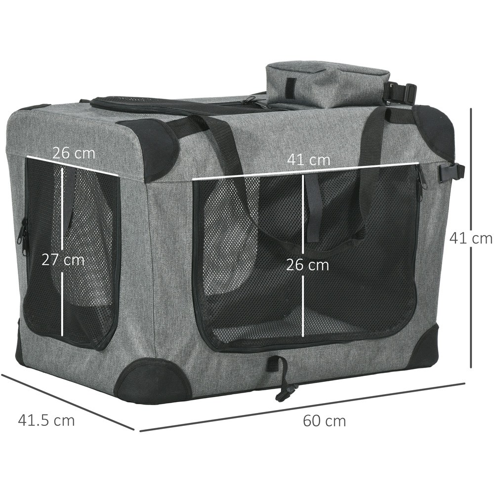 Travel in style with your pet with the PawHut 60cm Grey Foldable Pet Carrier Bag with Cushion, designed for small dogs and cats. This pet carrier features three convenient doors on the top, side, and front, along with a secure zip fastening for easy entry and exit. The use of mesh material ensures optimal ventilation, keeping the inside cool and airy, while a plush Berber fleece cushion on the bottom provides a cosy resting spot for your furry companion. For added convenience, this cat travel carrier includes two storage bags on the top and back, perfect for storing essential pet supplies. Thanks to its foldable design, transportation and storage are incredibly easy, making this dog carrier the perfect choice for pet owners on the go.