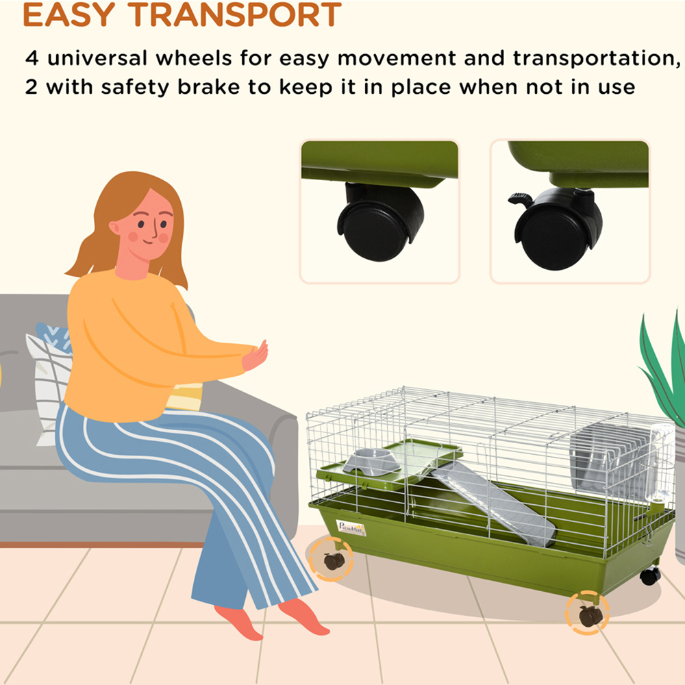 Give your small pet their own place to chill the day away with this Small Animal Cage from PawHut. Finished in green, it's made with a 44 x 89cm living area, protected by metal wire casing, keeping them safely inside and allowing air to flow through. Inside, it features an elevated platform with a ramp, a hay feeder, a water bottle and a food dish. The deep bottom tray is great for collecting waste and debris for easy cleaning. With a large front door and top door for easy access, it's finished with a deep base, which collects dirt and debris, and four wheels to move around easily. Ideal for maximum comfort for your pet, it's an ideal house for various small animals, including a small rabbit, guinea pig, ferret, chinchilla and other similar-sized small pets. Note: Not suitable for hamsters. Size: 89cm.