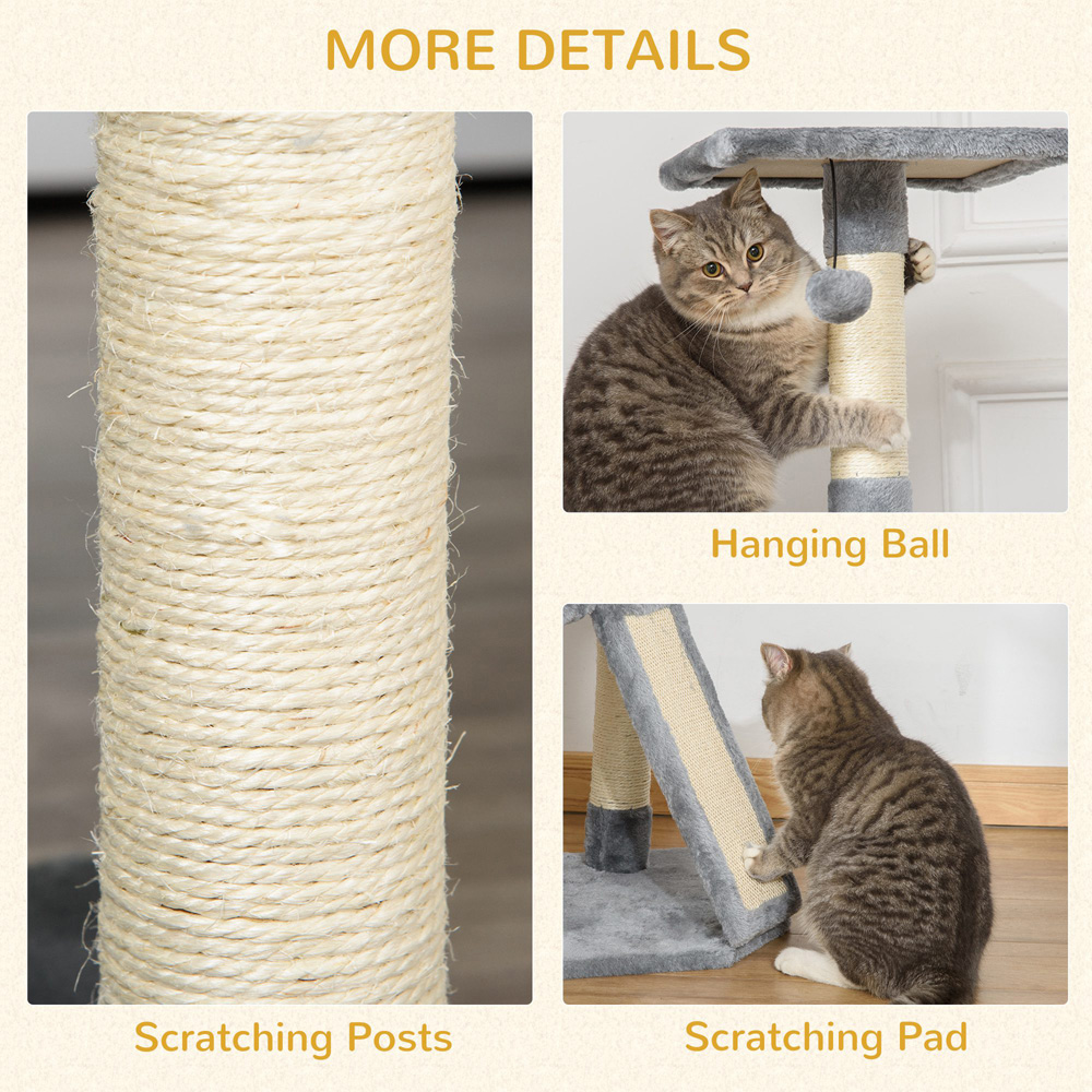 Treat your pet to this comfortable PawHut Grey Cat Activity Tree, designed to fit in the corner of your room. Featuring a cat house, perch and ramp, cats will have lots of space to play and relax. They'll dig their claws into the scratching posts and board, whilst the toy ball keeps them entertained when feeling playful. Covered with soft plush, it's comfortable on their paws, keeping them cosy. Finished with a stylish appearance that fits any decoration, you won't mind seeing it around the house.
