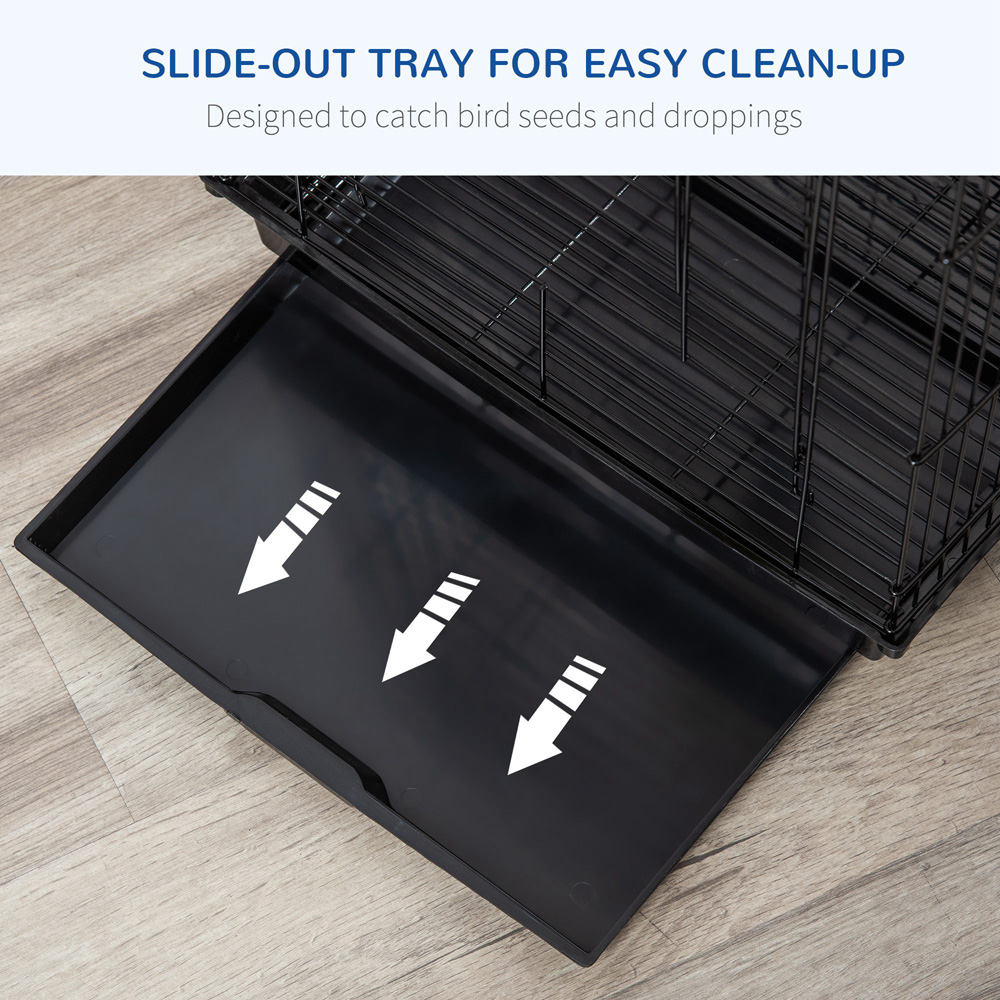 Treat your birds with the beautiful PawHut Bird Cage with Openable Top and Stand. This fantastic finch cage boasts a rooftop perch, so pets can enjoy the freedom outside of their cage. This feature also makes interacting with the pets easy. The top two handles enable effortless carrying of the cage wherever you need. The large doors allow for simple access, so you can cater to their needs and keep their space clean. The two wide perches are for resting on, with a spacious haven for birds to spread their wings and relax. This cage is a cosy home for your feathered friends to enjoy.