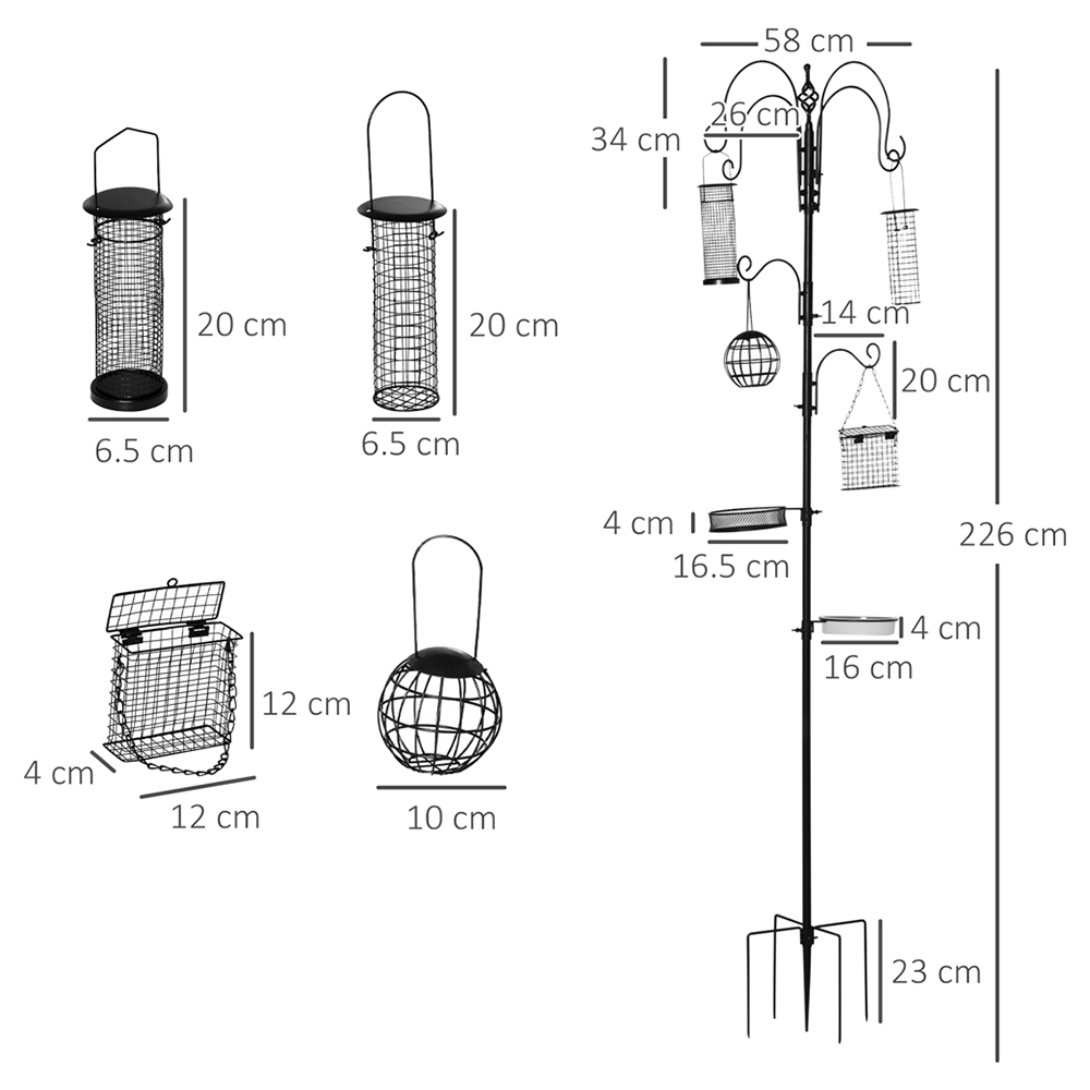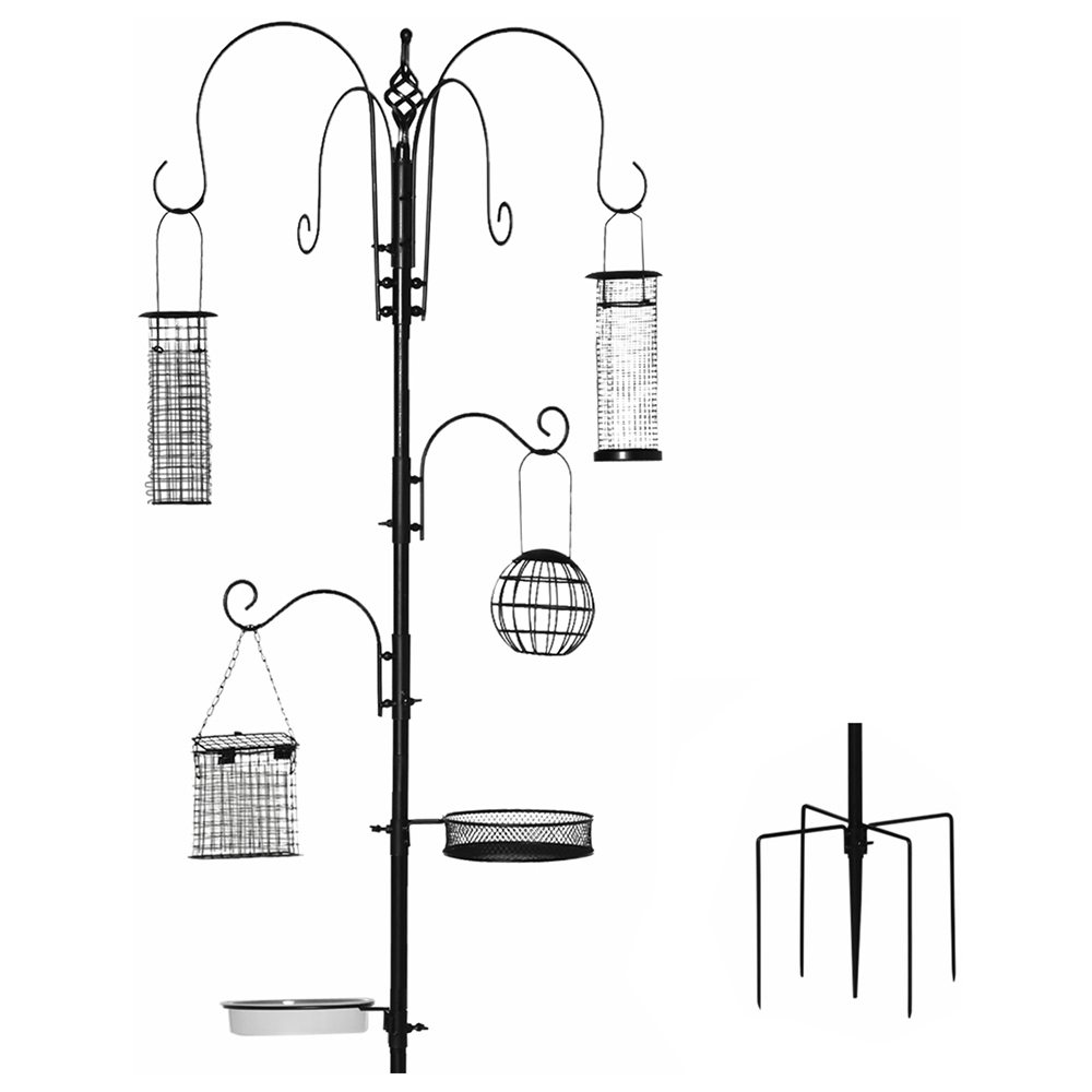 Attract a variety of birds to your gardens with this PawHut Bird Feeding Station Kit. This feeding station features six hooks and two trays in total, providing various choices to place feeders. With four different kinds of feeders and four prong base, the kit makes a stable and durable for reliable daily use. In addition, it's a great gift for parents, children and nature lovers. Put the bird feeding station outside your home near a window or on your patio for a delightful experience. The kit includes four large top hooks, two small hooks, a wire mesh tray, a plastic water tray and four feeders.