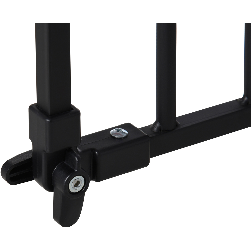 Keep your pets away from specific areas with the PawHut Adjustable Safety Gate with 3 Extensions and 4 Adjustable Screws. This gate in black colour can be easily adjusted to fit various sizes, making it suitable for hallways, doorways, and staircases. Its metal frame provides durability and stability. The gate's door automatically closes when opened at an angle less than 90 degrees, offering convenience and peace of mind. With the included accessories, assembling the gate is quick and easy, allowing you to promptly restrict your pets from accessing restricted areas. Additionally, the gate is equipped with two rotatable locks on the bottom sides, along with a top lock that can be effortlessly opened with one hand. The lead-free treatment on the surface further guarantees the safety of your beloved pets. Dimensions: 76.2 x 147.5cm.