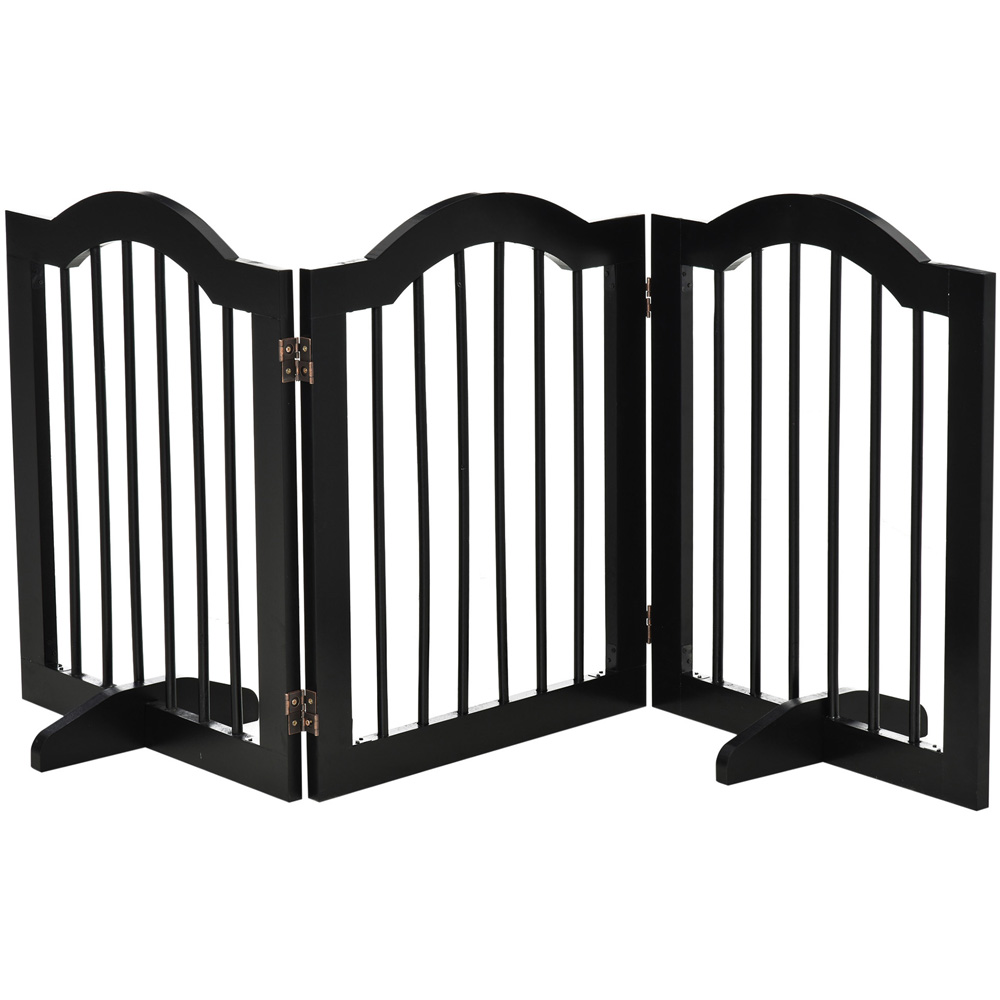 Keep your pets secure with the PawHut Black 3-Panel Freestanding Pet Safety Gate. It offers a convenient and secure solution for confining your pet while adding a touch of elegance to your home decor. Its innovative 3-panel design, equipped with sturdy hinges, allows for easy folding or setting up as a freestanding gate. The safety gate is made from high-quality solid wood and MDF, sealed with a sleek black finish, ensuring the safety and confinement of your pets when you're not around. When not in use, the foldable design allows for effortless storage. With its stylish wooden construction, this freestanding dog gate is suitable for any area of your home, including doorways, hallways, entryways, and staircases. Rest assured that it is sturdy enough with its two support feet, preventing any potential damage to your home.