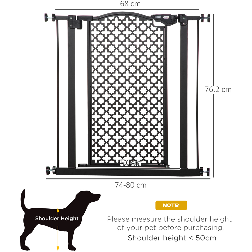 Ensure the safety of your pets with the PawHut Stair Pressure Fit Pet Safety Gate in black. Made from durable steel, this gate is designed to be long-lasting and can be adjusted to fit spaces ranging from 74-80cm. The double locking mechanism located at the bottom guarantees that your pets are kept secure, while also permitting convenient access through the gate. Featuring two rotatable locks for extra protection, the gate includes a door that automatically closes when opened less than 90 degrees. The sturdy steel frame further enhances stability and security while in use.