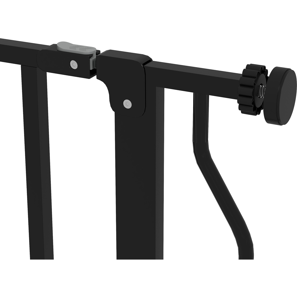 Keep your pets away from certain areas with the PawHut Door Pressure Fit Wide Stair Pet Safety Gate in black. Whether it's hallways, doorways, or staircases, this gate is adjustable from 75-115 cm to fit different sized openings. Constructed from durable steel, it remains upright and stable when in use. Additionally, it can be easily pressure-mounted for quick and hassle-free setup. With its double-locking system, you can conveniently open the gate with just one hand by pressing and lifting the button. The added lock block at the bottom ensures enhanced stability.