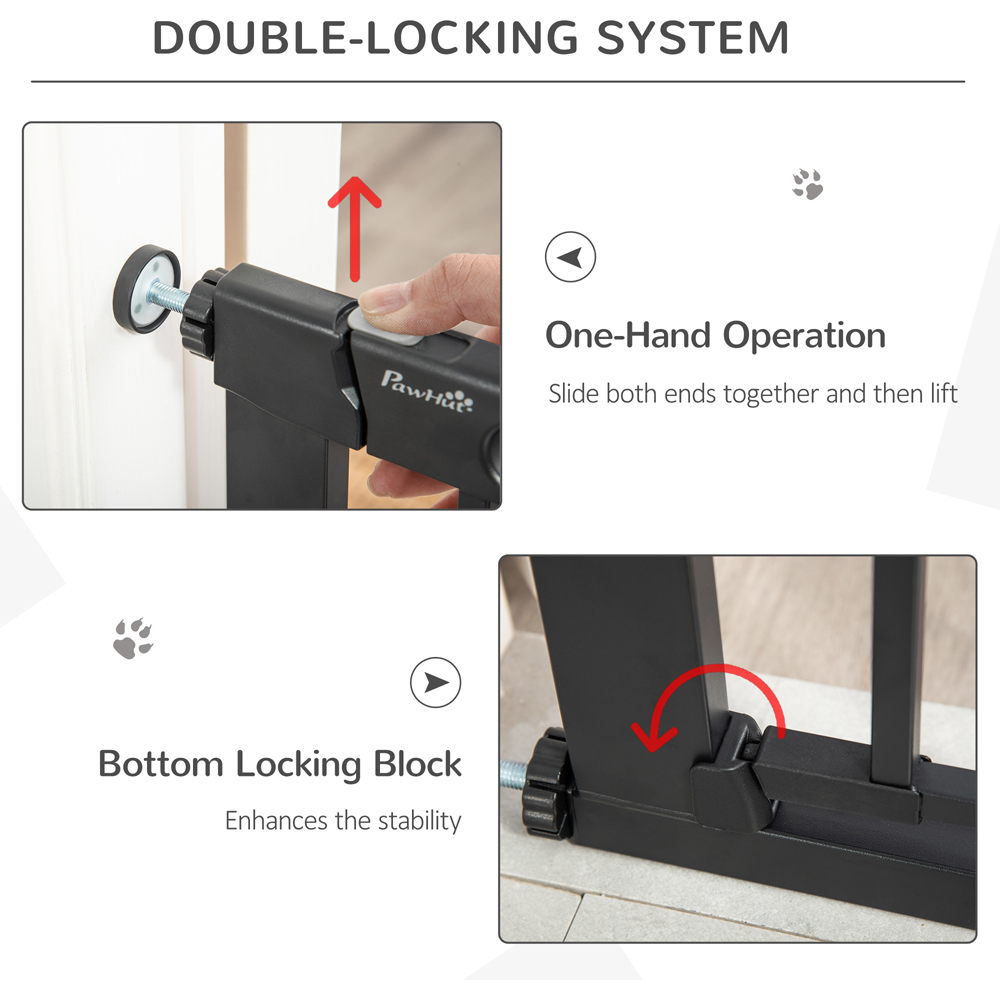 Introducing the PawHut Pet Safety Gate with Small Cat Flap in black. This pet stair gate is constructed from sprayed steel, ensuring strength and safety with its lead-free treated surface. With a width ranging from 75cm to 82cm, it can easily fit into various-sized spaces. The handle is designed for easy opening, allowing you to pass through quickly without worrying about your pet escaping. The double-locking mechanism provides maximum security, ensuring that your pet stays in place. The gate also features a small cat flap or door, providing convenient access for your pets. It can be kept open at all times if desired. The pressure-fit installation method allows for a simple set-up on any wall space. Please note that before installation, there may be a large gap at the door lock, but this is normal. Simply tighten both sides until the gap measures 2 to 3mm. Dimensions: 76 x 70cm.