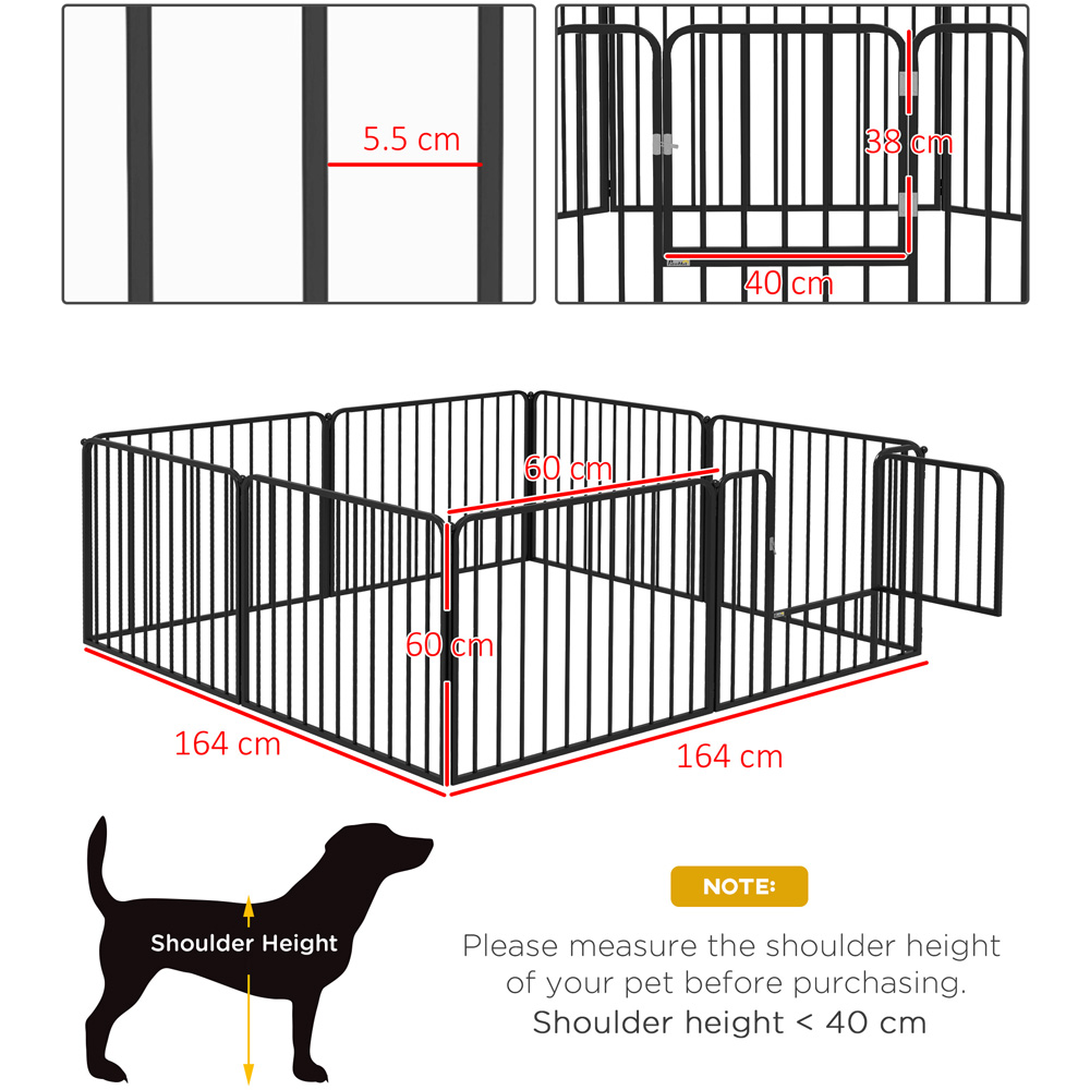 Transform any space into a safe and secure shelter for your pets with the PawHut Black 8 Panel Metal Playpen Gate. This set is made up of eight panels that can be arranged into various shapes to fit any layout effortlessly. Crafted with durable steel pipes and nine connecting ground stakes, this puppy pen offers unparalleled strength, stability, and reliability. Whether it's in your living room or garden, the robust metal construction ensures unwavering stability, providing your furry companion with a safe sanctuary. Setting up the playpen is a breeze – simply unfold it, stake it securely to the ground, and watch as your pets revel in their newfound space. With this playpen, you can relax and enjoy knowing that your pets are happy and secure in their designated area. Suitable for small dogs.