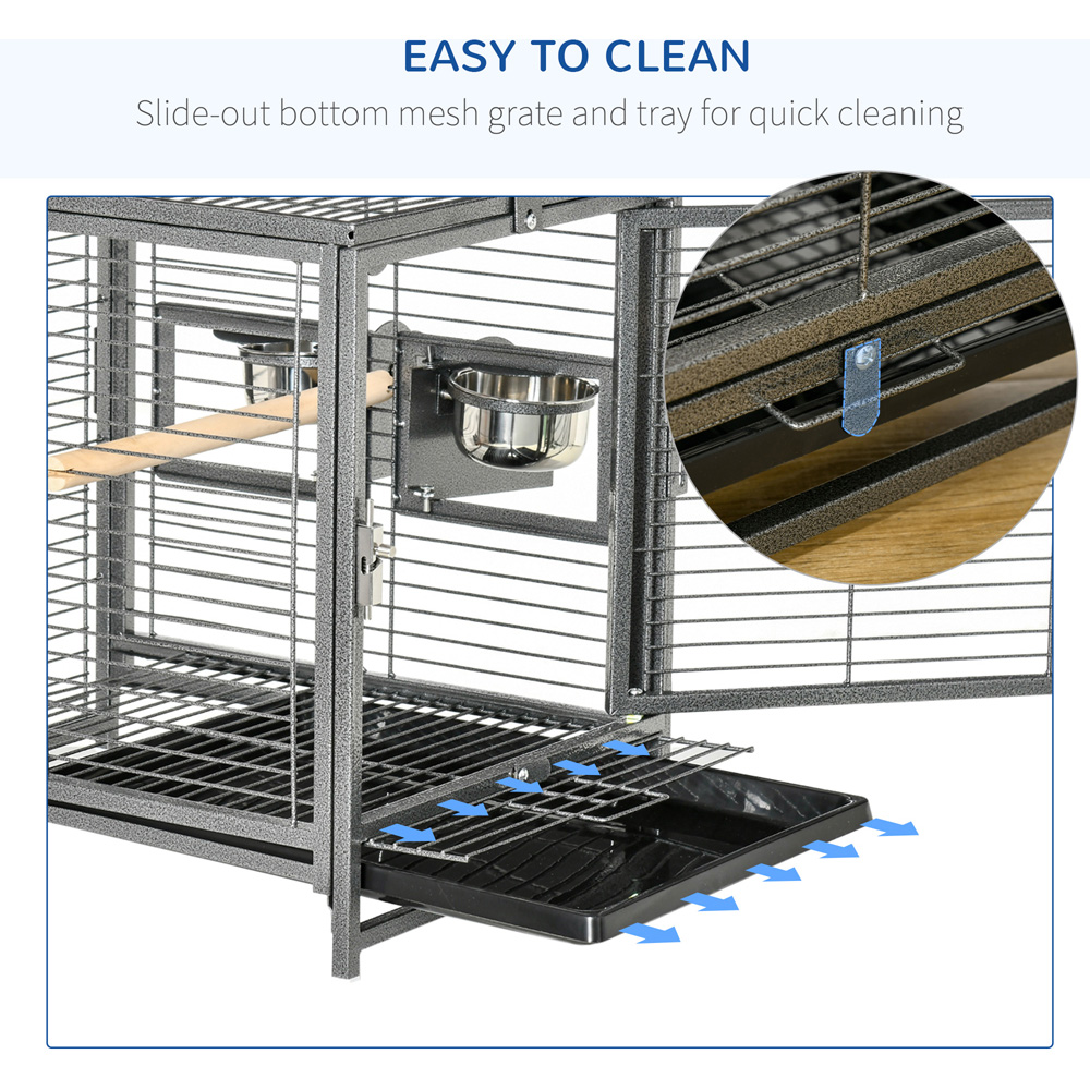 Travelling with pet birds has never been easier, thanks to this PawHut Black Bird Cage with Wooden Handle. Hassle-free for you and them, it's lightweight and compact and has a big handle on the top, so you'll carry it with ease. Pets will rest on the sturdy perches, as they enjoy their food and water from the provided bowls. Also, it comes with a removable tray at the bottom for quick cleaning, keeping their space tidy. Plus, the steel wire keeps pets safely inside, making sure they don't escape a secure home - perfect for the on-the-go.