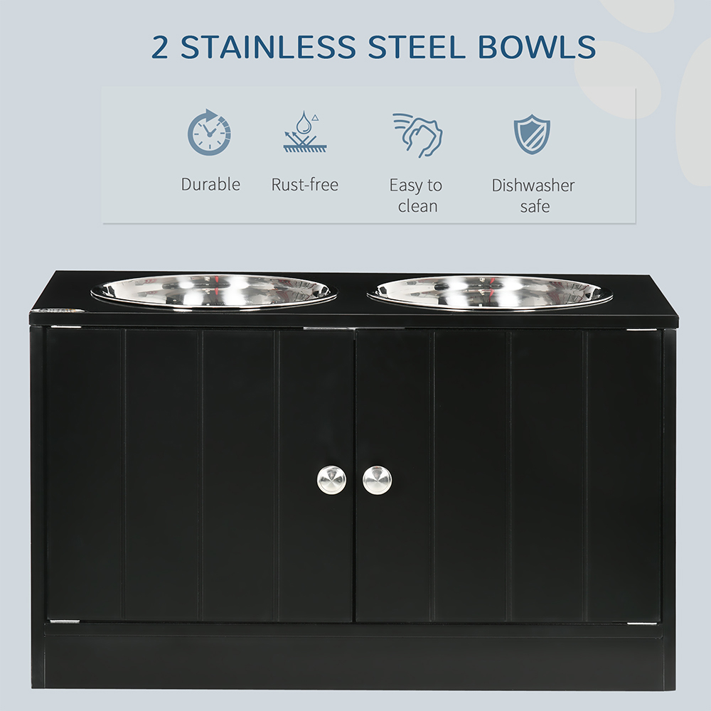 Enhance your pet dog's meal-time experience with the PawHut Double Black Raised Pet Dog Feeding Station with Storage. It is crafted using solid panels and a sturdy base with two stainless-steel bowls and two handles with storage space. The 2L removable bowls are hygienic and easy to clean with an ideal design for serving both food and drink. This elevated feeder makes eating cleaner and easier for your pets, reducing the strain on their necks while aiding the digestion process.
