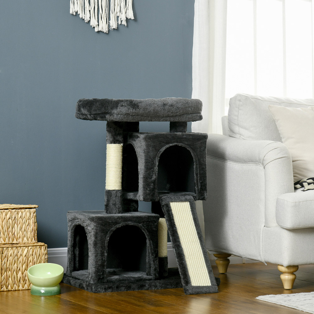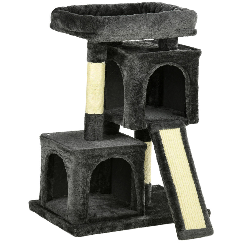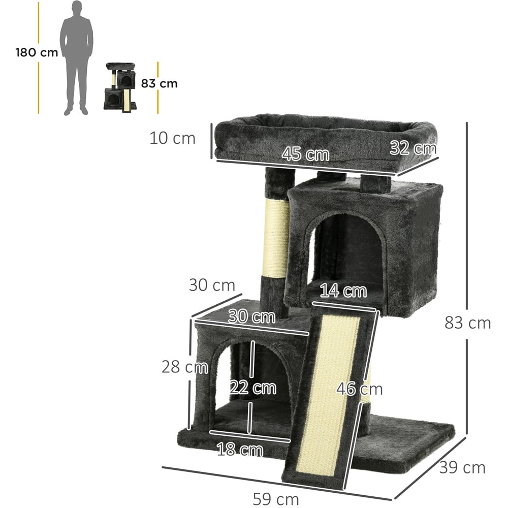 Whether your cat is feeling a bit mischievous or sleepy, this PawHut Luxury Cat Activity Tree in black will fulfil their needs. The frame is made from particle board, ensuring a reliable structure, and it features sisal scratching posts, a sisal scratching platform, two large houses and a large top cushioned perch. It is covered in soft plush, which makes this tree soft and safe for your pet. It's finished with a large base to keep it upright and in place. An activity centre for them to adore all day and night long.