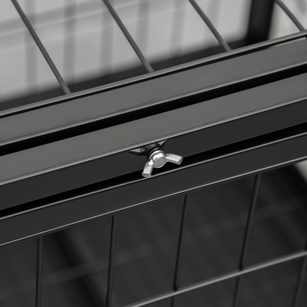 Give your furry friend a spacious and stylish haven with the PawHut Black Metal Medium Dog Pet Crate 92cm. The dog crate is a versatile and reliable option suitable for both puppies and adult dogs. Whether you're using it for potty training, house training, establishing boundaries, or providing a secure space for your pet to rest and relax, this metal dog crate offers exceptional convenience. It features strong welds at stress points and a robust latch on the door, ensuring safety and durability. The sturdy metal construction is complemented by a rust-resistant powder-coated finish, making it suitable for long-term use. With mini dividers designed to prevent paws from slipping through, a grated floor with a tray for easy cleaning, and casters at the bottom for effortless movement, this crate is designed to keep your pets happy and healthy while providing convenience for you.