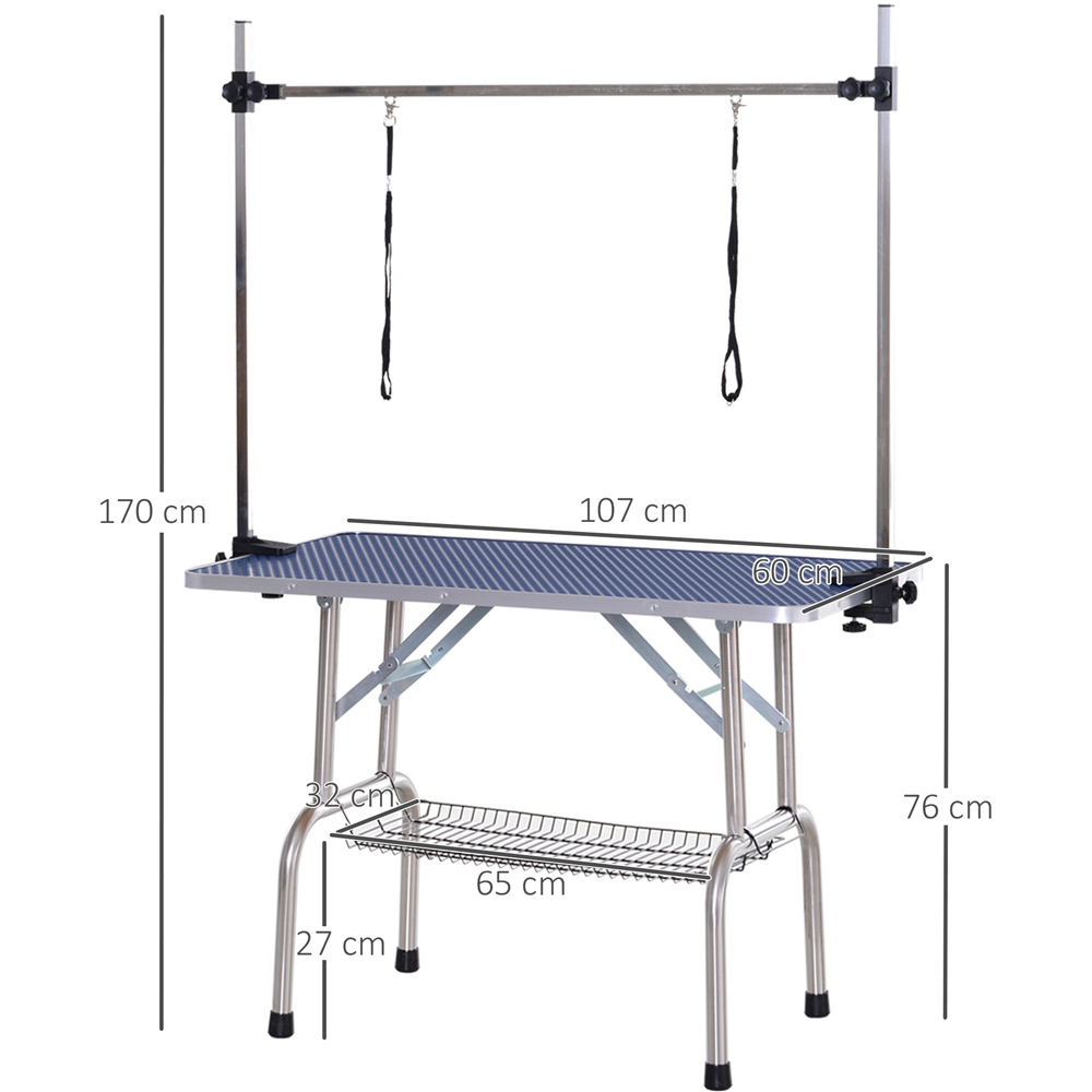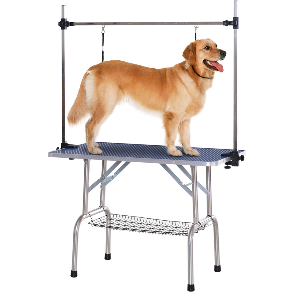 Keep your pet dog clean and stylish while grooming it with the PawHut Blue Metal Adjustable Dog Grooming Table. This table is ideal for washing, trimming fur or grooming them for a fresh new look. It is crafted using a sturdy metal frame and an adjustable design with up to 100kg weight capacity. The adjustable height allows you to trim, bathe and groom your dog according to your preference. It features a non-slip rubber mat tabletop that keeps your dog steady and comfortable for a long time while grooming. This table also features sturdy feet with rubber foot pads for stability and support.