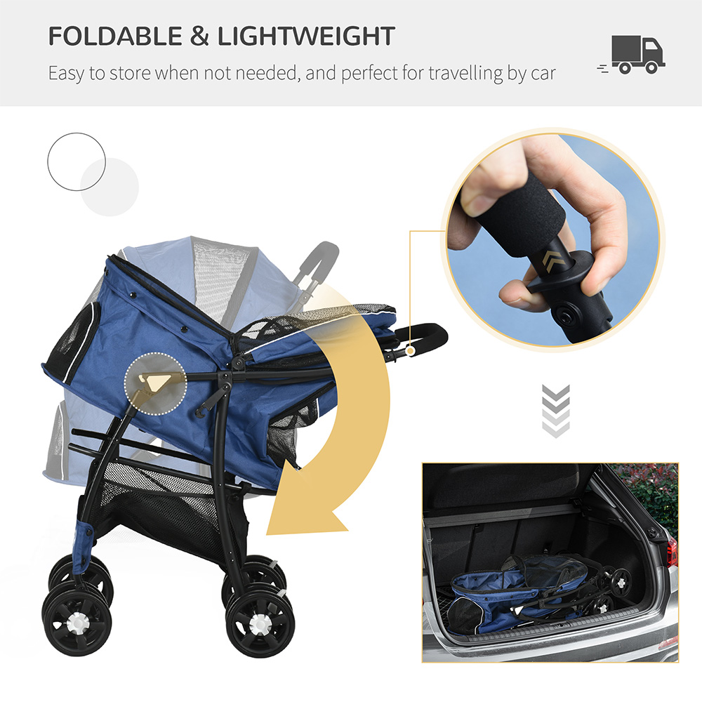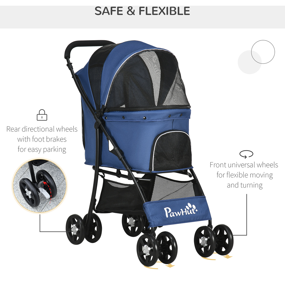 Take your pet outdoors with this PawHut Blue Pet Stroller. Pets can comfortably sit in this spacious buggy, watching the world go by. Easy to move, thanks to the two EVA wheels and two universal front wheels that make pushing the buggy along effortless and ensure a smooth ride while two safety leashes keep them secure inside. Ensuring safety, the wheels come with a brake so it doesn't roll off when not being used. Made with steel, this stroller holds up to 10kg - perfect for extra small and small dogs.