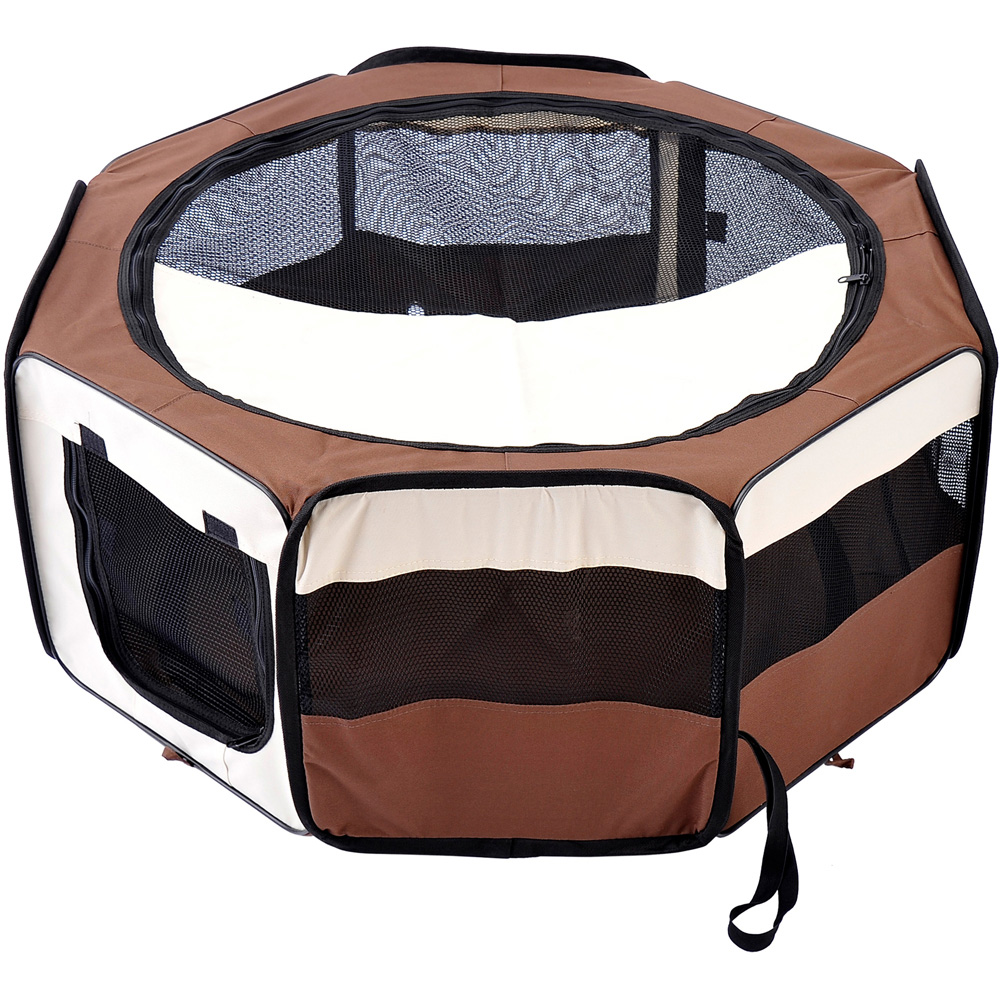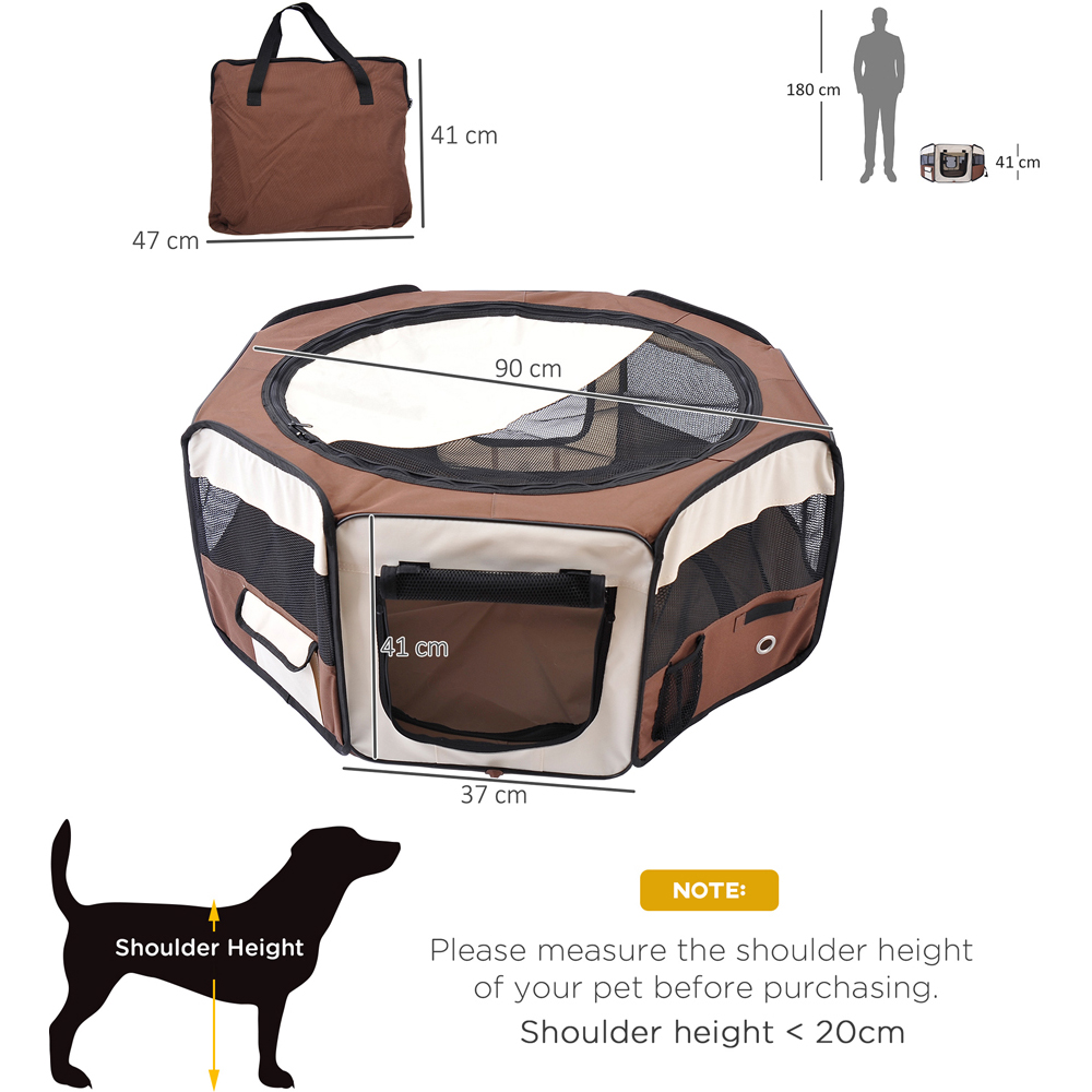 Create a safe and cosy space outdoors for your pets with the PawHut Brown and Cream Fabric Pet Playpen. This stylish puppy playpen in an octagon shape is a great solution for cats, dogs and other small animals. They can be kept safe in this cosy playpen which features eight panels covered with breathable mesh fabric. The soft mesh panels provide breathability and are beneficial for visibility and air circulation. The mesh cloth top cover is fixed with a zipper for safety and shade purposes. The cushion is crafted using 600D waterproof Oxford cloth on the bottom and is removable for easy cleaning purposes. It features two roll-up and zipped doors for easy access with decent space for the pets. It has a lightweight and portable design with a carry bag for easy transportation.