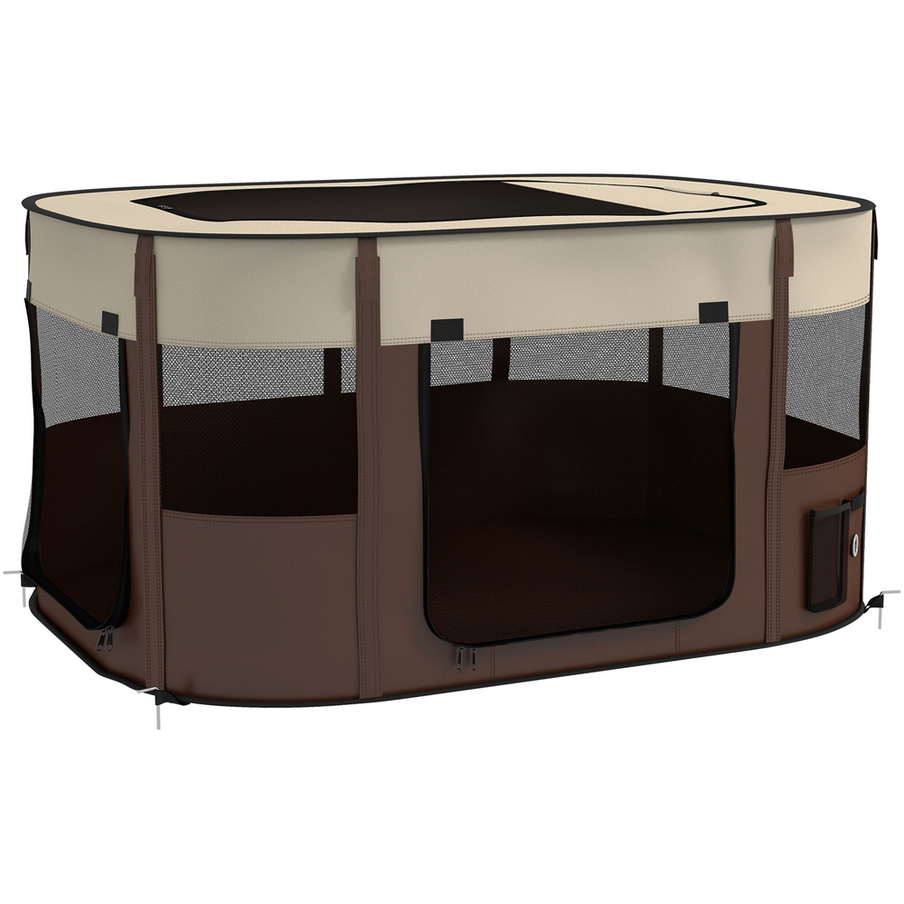 Treat your beloved pets to the ultimate relaxation with the PawHut Brown Portable Small Animal Playpen XL. Constructed from durable 600D Oxford fabric, this playpen offers a perfect balance of lightweight portability and exceptional strength. Its secure design provides a safe and comfortable environment for your pets, with three mesh windows and three doors allowing for ample ventilation and accessibility. Whether you choose to set it up indoors or outdoors, stability is ensured with the inclusion of four ground stakes. The playpen can be easily folded for convenient storage and hassle-free travel, and the added storage bags on the windows allow you to keep toys and essentials nearby.