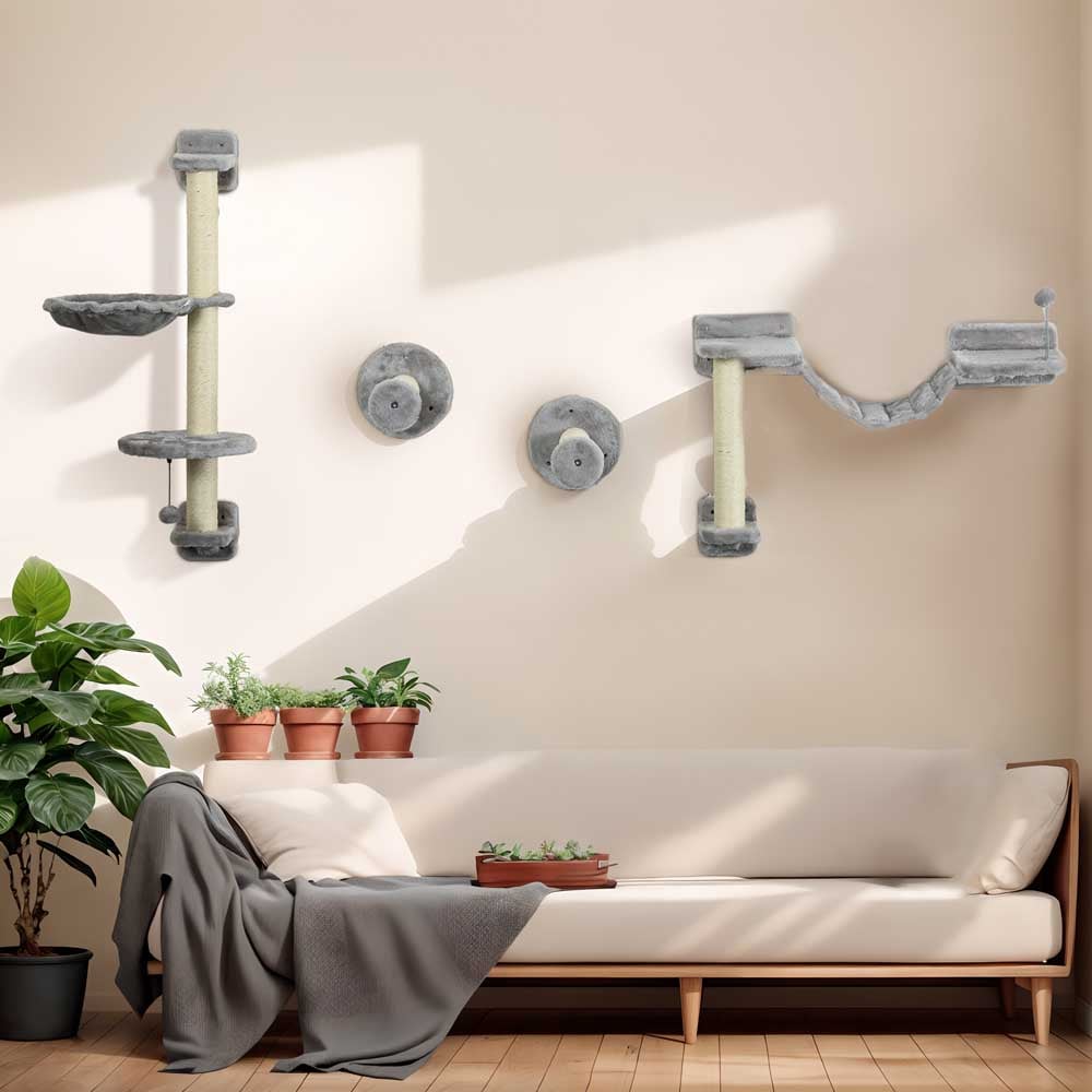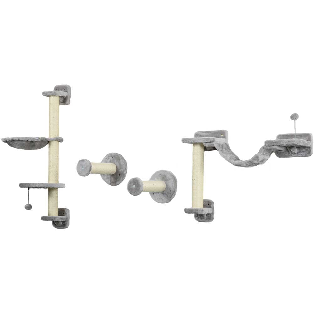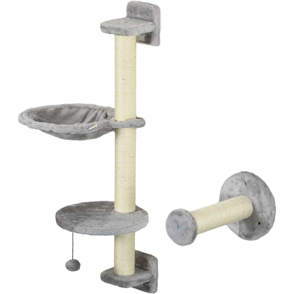 Introducing the PawHut Grey Cat Wall Furniture with Hammock, a practical set that transforms your wall into a cosy haven for your beloved pet. This innovative design provides a safe space for cats to indulge in their natural behaviours, such as scratching on the posts and satisfying their hunting instincts with the spring teaser ball. The multiple platforms covered in soft plush offer a comfortable spot for them to relax and unwind. By utilizing your wall, this cat shelf set saves valuable floor space, making it ideal for smaller rooms. Each day will be filled with comfort and joy for your furry friend. This multi-level cat tree encourages pets to climb and jump, keeping them active and entertained. The soft plush covering adds an extra layer of comfort, ensuring your pet's contentment as they curl up. Crafted with a sturdy multilayer board, this cat wall provides stability and support, keeping your pet safe at all times.