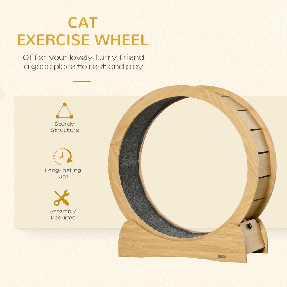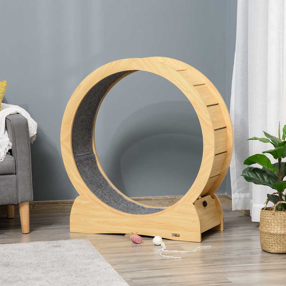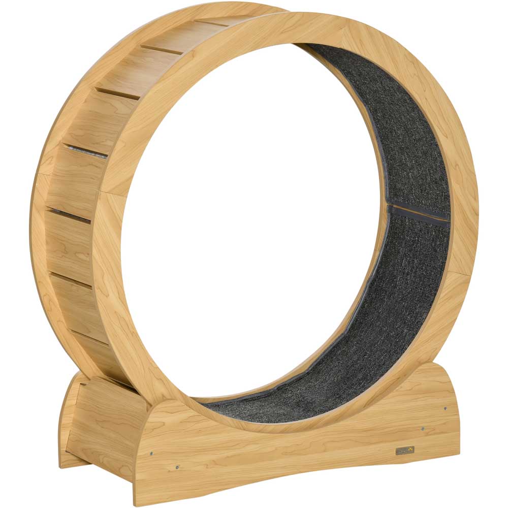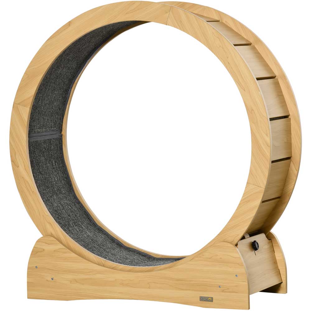The PawHut Cat Wooden Running Wheel with Brake makes your feline friend to stay active and maintain their health even within the confines of your home. The interior of the wheel is lined with a soft cloth-like material, ensuring utmost comfort for your cat's paws while they enjoy their running sessions. With a convenient brake located on the base, you can easily stop the wheel whenever necessary. And when your cat is ready to resume their active playtime, simply turn off the brake and let them run freely. Made from natural wood with a sleek and minimalistic design, this running wheel seamlessly blends with any home decor. It's the perfect solution for house cats who need a way to exercise indoors. Get your furry friend this cat exercise wheel and watch them stay healthy and happy!