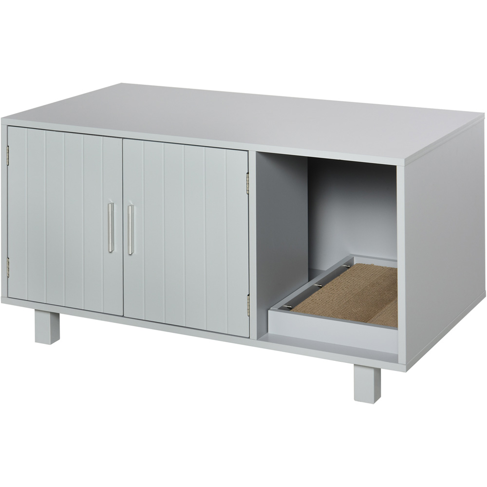 Get a cat-friendly and space-savvy solution with this PawHut MDF Multi-Functional Enclosure Grey Cat Litter Box. A cat box furniture that can be used as an enclosed cat bed or placed right next to the bed as a bedside table. Features a cut-out entrance for your cat to enter and exit easily, and the shelves have two doors with aluminium alloy handles and magnetic closures. Additionally, the cat scratcher on the right side saves your furniture and carpet from claw marks and provides cats with a place to paw to their heart's content. Made from durable MDF material, the structure of this cat litter box is safe for pets to use, and the surface can be easily wiped and cleaned. A multi-purpose solution that can serve as a pet house, nightstand, side table, or storage cabinet and matches any modern interior.