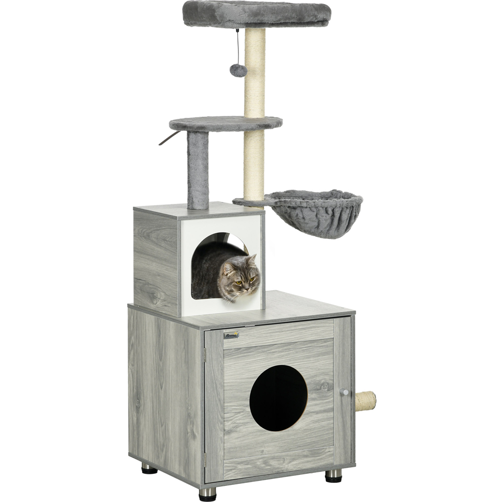 Enhance your cat's environment with the PawHut Enclosure Grey Cat Litter Box. This innovative design merges a cat tree with a litter box, offering a multi-functional space for your cat to play, exercise, and use the toilet. The tree features several levels for climbing, scratching posts to preserve your furniture and a private enclosed litter box. Your cat can relax in the plush hammock or on the top perch. Constructed from durable particle board with an anti-tip rope, it ensures stability and comfort.