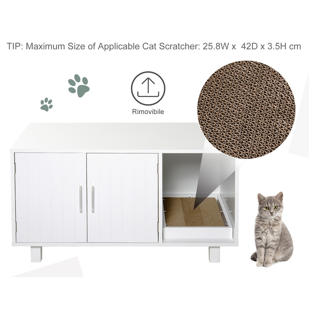 Get a cat-friendly and space-savvy solution with this PawHut MDF Multi-Functional Enclosure White Cat Litter Box. A cat box furniture that can be used as an enclosed cat bed or placed right next to the bed as a bedside table. Features a cut-out entrance for your cat to enter and exit easily, and the shelves have two doors with aluminium alloy handles and magnetic closures. Additionally, the cat scratcher on the right side saves your furniture and carpet from claw marks and provides cats with a place to paw to their heart's content. Made from durable MDF material, the structure of this cat litter box is safe for pets to use, and the surface can be easily wiped and cleaned. A multi-purpose solution that can serve as a pet house, nightstand, side table, or storage cabinet and matches any modern interior.