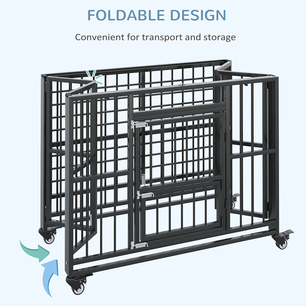 Give your furry friend a spacious and stylish haven with the PawHut Foldable Heavy Duty Pet Dog Crate with Wheels 109cm. This cage features a large door with a smaller door for easy feeding access, as well as an openable top for effortless interaction with your furry friends. Equipped with universal wheels, this cage offers seamless mobility, while the removable pan ensures hassle-free cleaning, keeping your pets' living space fresh and tidy. Not only is this cage a space-saving marvel, but it also easily folds for convenient storage. Enhance your pets' comfort in style while also simplifying storage and maintenance.