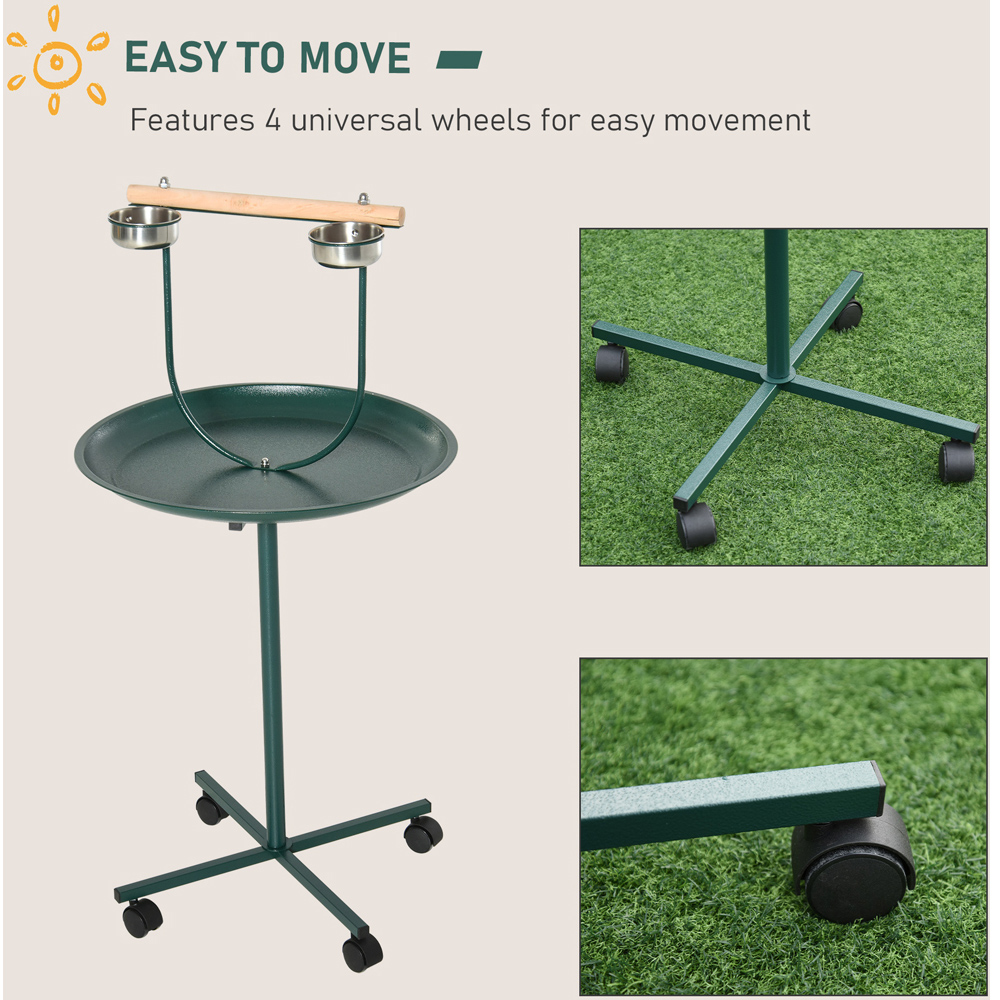 Give feathered friends a place to play, eat and explore with this green T-stand bird training perch, designed for easy indoor movement and mess-free relaxation. Birds can stretch and flap on the solid wooden perch while enjoying food and water from the two stainless steel bowls, all kept tidy with a spacious high-edge tray underneath. Four smooth wheels let you move the perch stand wherever you like, so curious cockatiels and parrots can always be part of the action. Durable stainless steel, powder-coated metal and fir wood construction ensures a safe and stable spot for your pet to rest and train.
