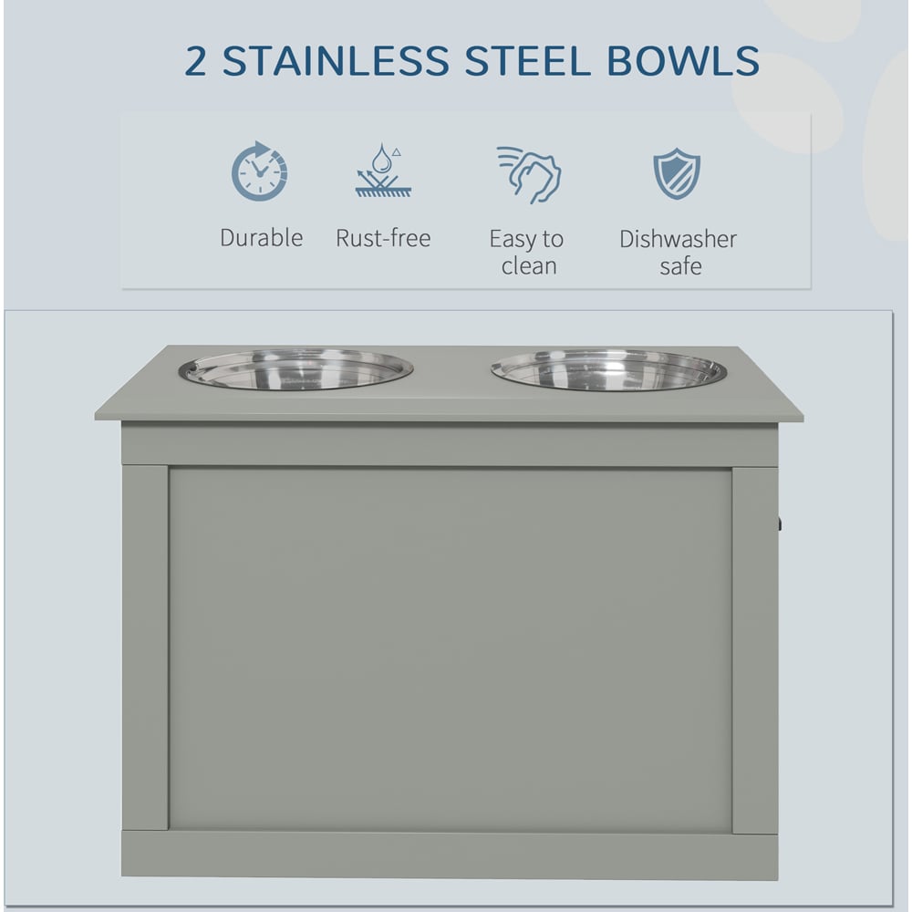 Elevate your pet dog's meal-time experience with the PawHut Double Grey Raised Bowl Pet Dog Feeder with Storage. It is crafted using solid wood panels and an MDF base with two stainless-steel bowls and two handles with storage space. The removable bowls are hygienic and easy to clean with an ideal design for serving both food and drink. This elevated feeder makes eating cleaner and easier for your pets, reducing the strain on their necks while aiding the digestion process.
