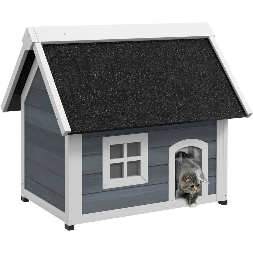 Create a cosy heaven for your furry friend with this PawHut Grey Outdoor Feral Cat House. This outdoor cat kennel features three doors for easy access - two with curtains for privacy and a side door as a ladder. There is an internal board which is for resting. A clear window provides ventilation and visibility. The openable roof of this cat shelter ensures effortless cleaning, keeping your pet's space tidy and hygienic. With a waterproof asphalt roof and fir wood, this outdoor cat house for winter provides a weatherproof shelter. Its elevated feet with protective foot pads stand up to the elements.