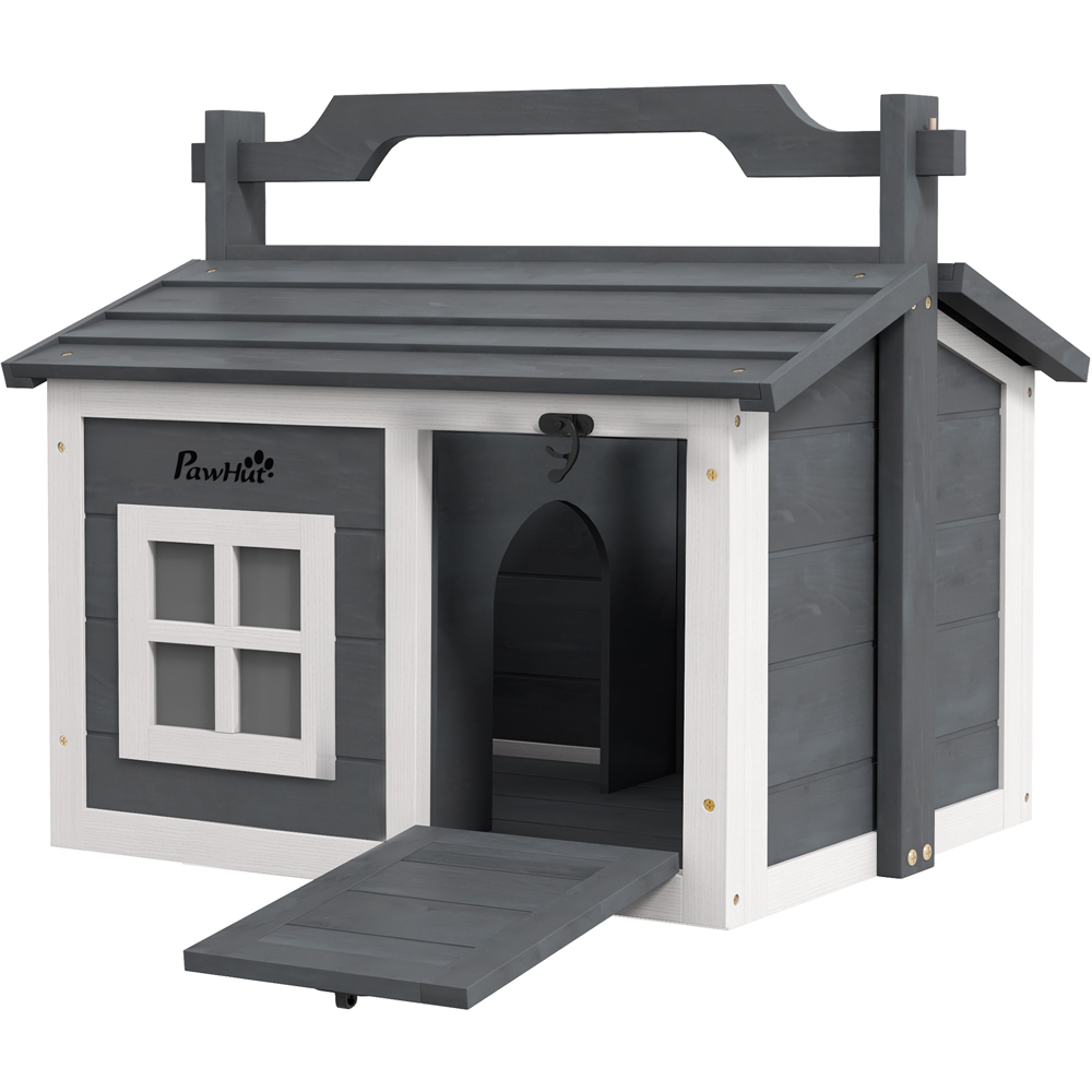 Protect small pets with this PawHut Grey Rabbit Hutch with a Top Handle and Openable Roof. Boasting two rooms, there's plenty of space in this hutch for your pets to explore and relax. The openable roof allows easy access, while the top handle ensures effortless movement. Easy to maintain, the openable roof makes cleaning easy providing hygienic and a comfortable environment. Combining style and convenience, this hutch will make a wonderful addition to your space – indoors or outdoors. Sturdy and strong, this rabbit hutch safely supports pets when inside, creating a haven for pets to relish in. It can also be used as a cat or puppy house. Please note: Rabbits need regular and frequent opportunities to exercise. Make sure your rabbits have opportunities to exercise every day to stay fit and healthy. Rabbits are most active in the early morning, late afternoon, and overnight, so every effort should be made to ensure rabbits have access to a large area to exercise at these times. The hutch provides shelter, while rabbits should additionally be provided with a large living enclosure.