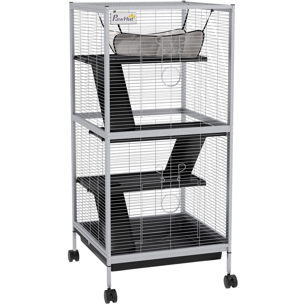 Pets love to roam and explore – with this spacious PawHut Grey Small Animal Cage, they'll enjoy a roomy and secure home. Four levels, connected by ramps, so pets can run around freely. To relax, they'll lay on the snug hammock at the top. Resting on four wheels, the cage can move around, whilst the multiple doors give easy access inside. There's a tray at the bottom for catching litter, which is removable for effortless cleaning, keeping their space tidy. A stable home for small pets to thrive.