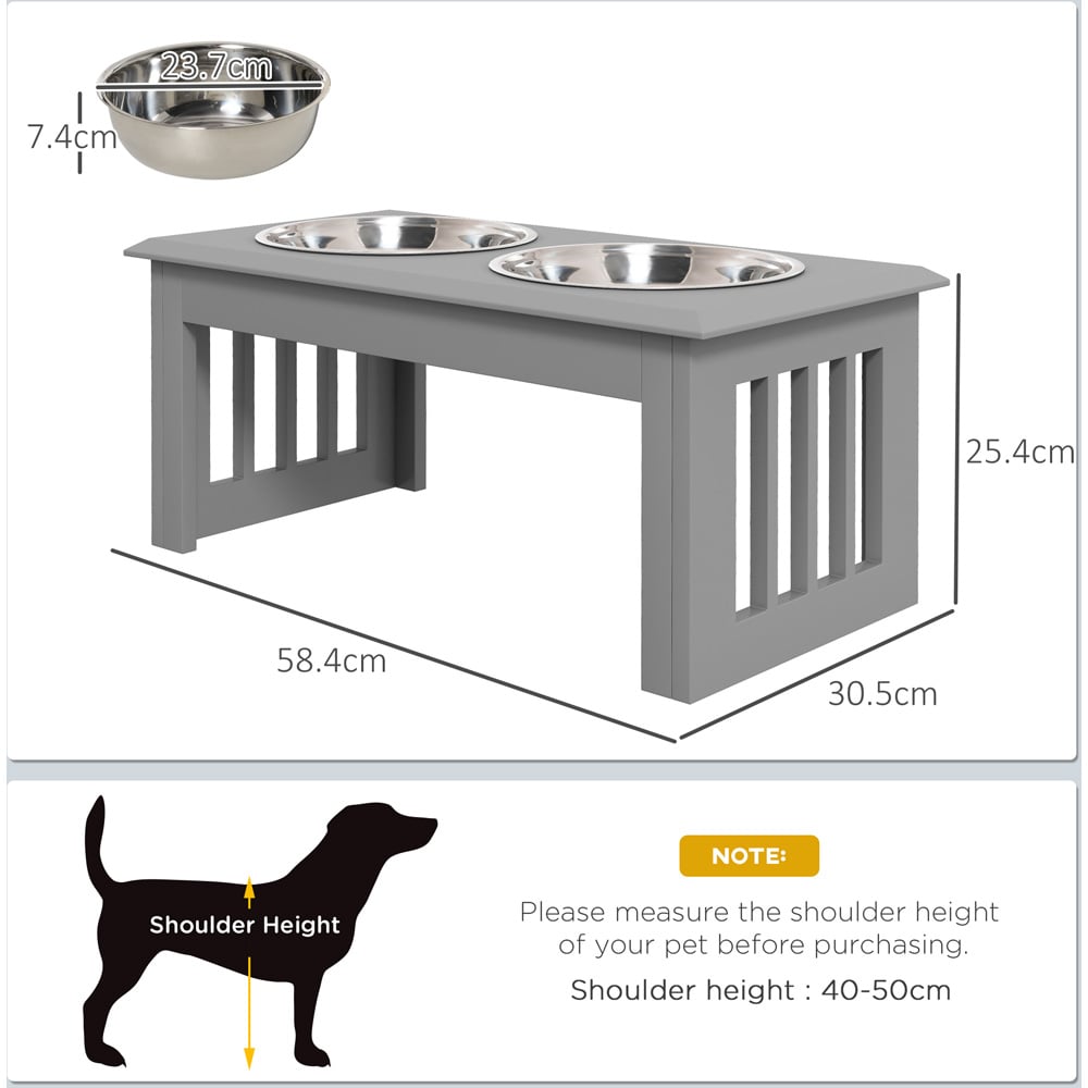 Make mealtimes more convenient for your furry friends with the PawHut Grey Stainless Steel Twin Bowl Raised Dog Feeder. This innovative product features an MDF construction that is designed for long-lasting use, along with two round stainless steel bowls. The robust, hygienic, and dishwasher-safe bowls are easy to maintain and safe for your pets. The elevated design of the base promotes cleaner and easier eating, which can aid digestion and reduce strain on your pet's neck. Additionally, the non-slip base keeps the bowls secure while the water-resistant frame ensures durability. Suitable for small and medium dogs.