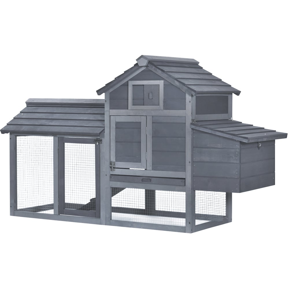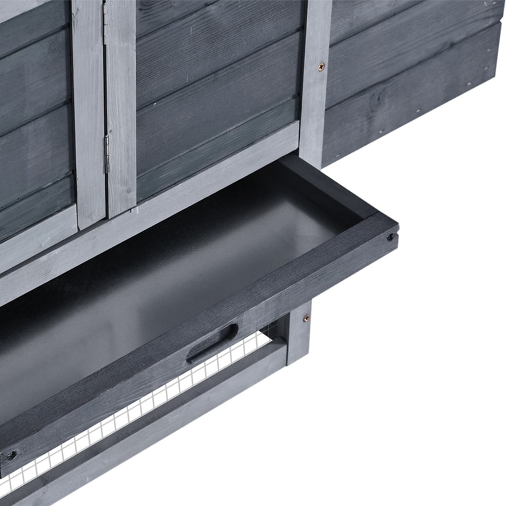 House your chickens in this PawHut Grey Wooden Chicken Coop. Combining a house and an enclosed outdoor area, chickens will enjoy moving around and playing in this coop. The house is painted with non-toxic paint and built from solid fir wood to provide durability. Besides a ramp for your chickens to walk in and out hassle-free, this coop also has a slide-out dropping tray for easy cleaning. Safe, comfortable and beautiful, it's the perfect coop for your chickens.