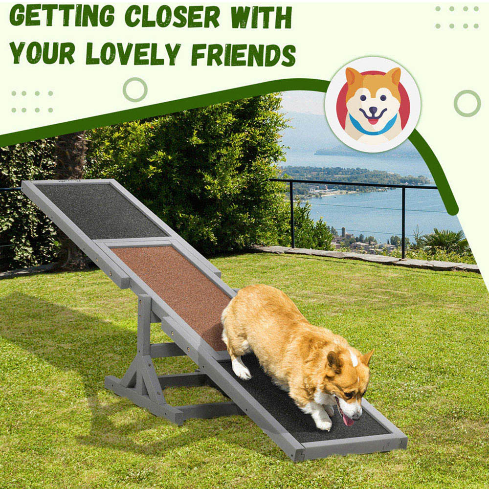 Bring a fantastic addition to agility training for dogs with the PawHut Grey Wooden Large Dog Pet Seesaw. This seesaw is designed to channel your dog's energy as they have a blast running up and down, staying active and mentally engaged. The non-slip surface ensures their safety by reducing the risk of slipping or falling. Made with durable fir wood, this seesaw can support up to 30kg, making it suitable for most breeds and sizes. This equipment is excellent for enhancing agility, endurance, and concentration while strengthening the bond between you and your furry friend. It's suitable for dogs of all sizes including small, medium, and large breeds. The anti-slip surface provides a secure and safe environment for your dog to freely enjoy running up and down the seesaw. The solid fir wood construction makes it easy to maintain and perfect for outdoor use.