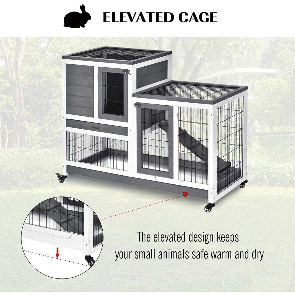 This indoor hutch from PawHut is suitable for small animals. The structure is made from fir wood for solid and sturdy wear. It is crafted into a two-tier raised design, consisting of the house area and the spacious bottom hutch, connected via a large ramp to give your pet plenty of room to move about. The wood is coated with water-based paint, which gives it extra protection. It features four wheels, two with brakes, which allow you to move the hutch around smoothly and easily. The two locking doors and two pull out trays allow easy access inside for cleaning and changing food, water and bedding. It's finished with steel wire around the run to keep them enclosed and four wheels to move around easily. Please note: Rabbits need regular and frequent opportunities to exercise. Make sure your rabbits have opportunities to exercise every day to stay fit and healthy. Rabbits are most active in the early morning, late afternoon, and overnight, so every effort should be made to ensure rabbits have access to a large area to exercise at these times. The hutch provides a shelter while, rabbits should additionally be provided with a large living enclosure.