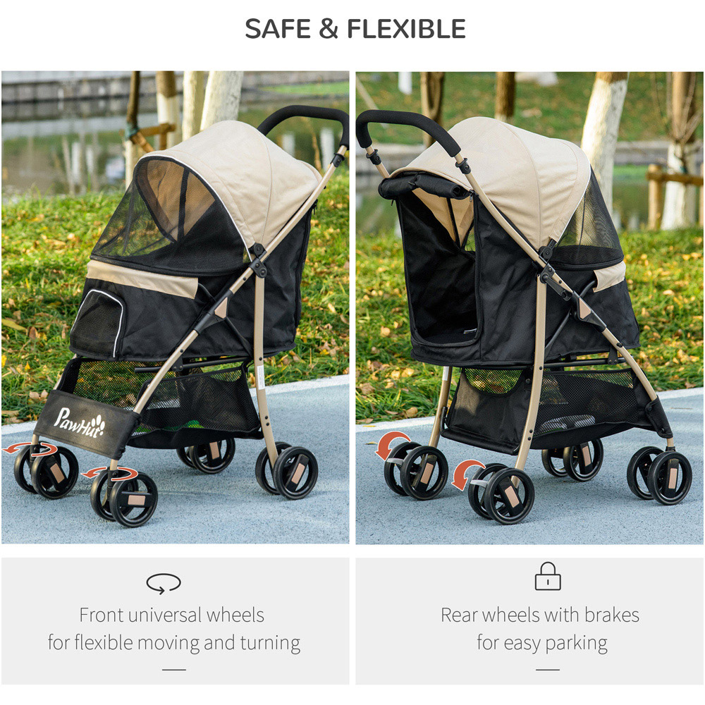 Enjoy outdoor adventures with your dog using the PawHut Khaki Pet Stroller with Rain Cover. Designed for safety and comfort, it features smooth wheels, a spacious mesh-top basket, and a three-level canopy for shade. The bottom basket and zipped pouch are for taking essentials on the go, whilst the rain cover prepares you for unpredictable weather. Ensure your pet's joy and security on every outing, making traveling that much better. Plenty of room for pets to relax, protected with an adjustable overhead canopy. A stable and secure structure, this dog pushchair fully supports your pets when inside. The frame is foldable and lightweight, making it easy to store and carry. Features a bottom basket and a zipped pouch for storage Mesh windows for ventilation, keeping pets cool and comfortable. Zipped doors for easy access, whilst the two leashes keep pets securely inside. Four wheels: The rear wheels have brakes and shock-absorption hardware for safety. The front wheels swivel 360° for smooth movement, making it effortless to push this dog stroller.