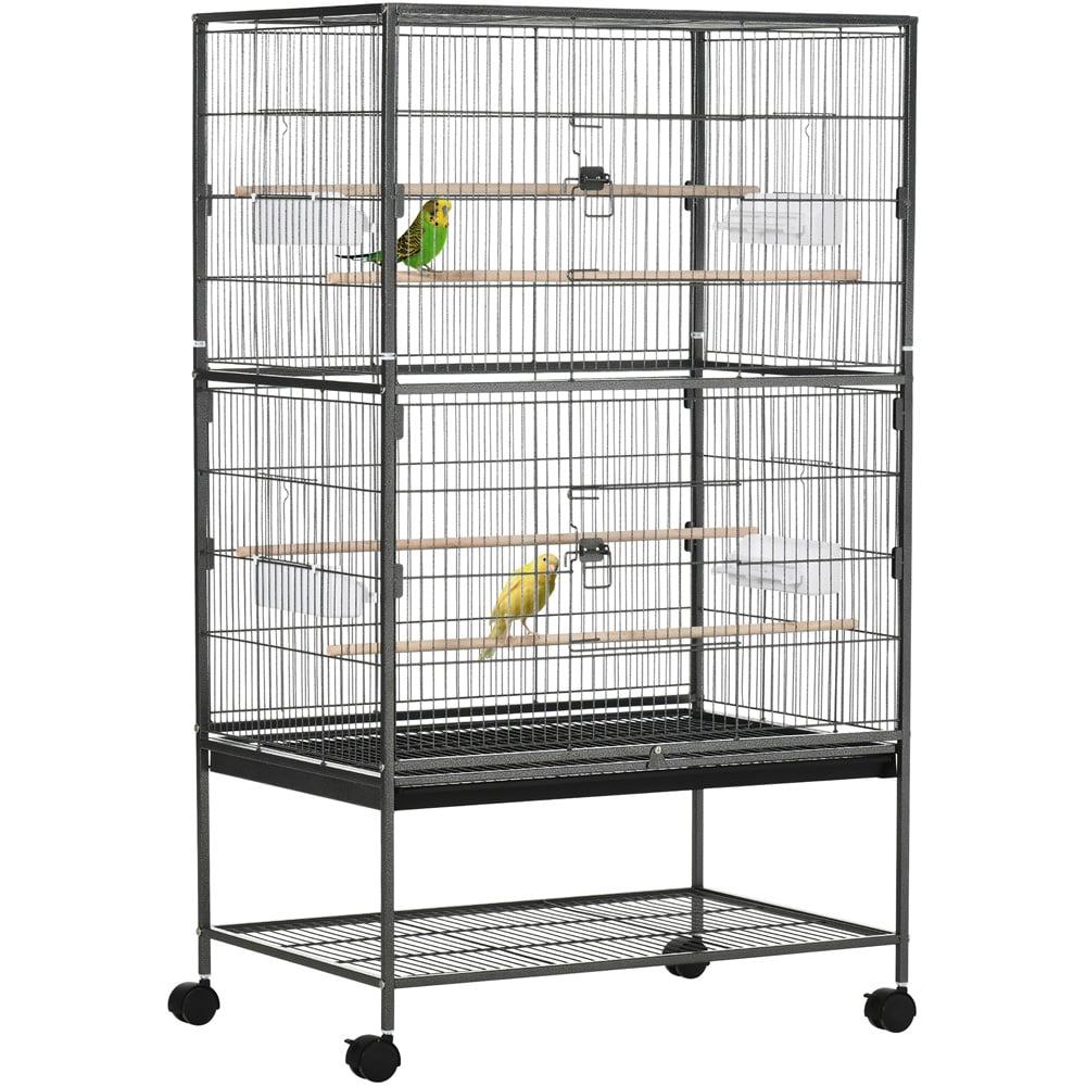 Keep your beloved pet birds safe with the PawHut Large Grey Bird Cage with Stand. This cage provides your feathery friends with extra space to flap their wings and thrive. It includes four wooden perches for your pets to stand, while the four plastic containers are for easy feeding. The cage features two large front doors and four side doors for easy access and ensuring they have enough food and water. The bottom pull-out tray makes for effortless cleaning, keeping their cage hygienic. The four wheels enable you to roll the cage to any area with minimum fuss.