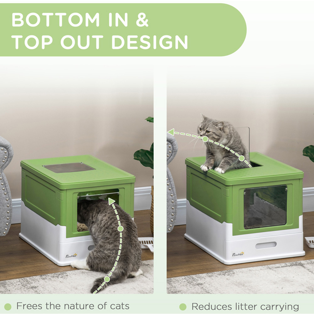 Elevate your pet's litter experience with the PawHut Light Green Cat Litter Box 37 x 36 x 48cm. It offers pets a private and cosy space while effectively hiding unpleasant odours, helping your living space stay fresh. Your furry friends can enter through the front door and exit through the top, preventing them from tracking litter throughout the house. The high edges of the tray ensure that everything stays neatly contained inside. Additionally, the included scoop and removable tray make it easy to keep the area clean, and the side buckle allows for effortless disassembly and thorough cleaning.