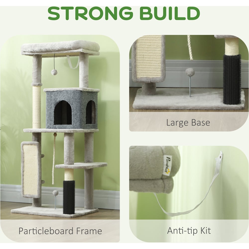 Allow your cat to express themselves with this PawHut cat tree, a safe space for climbing, playing and relaxing. Its strong particle board frame and anti-slip kit ensure balance and stability. Wrapped in sisal, the scratching post is great for claws, while the hanging toy ball grabs their attention during playtime. When it's time to rest, your cat can lounge on the plush-covered platforms, providing a high vantage point to relax and observe their surroundings.