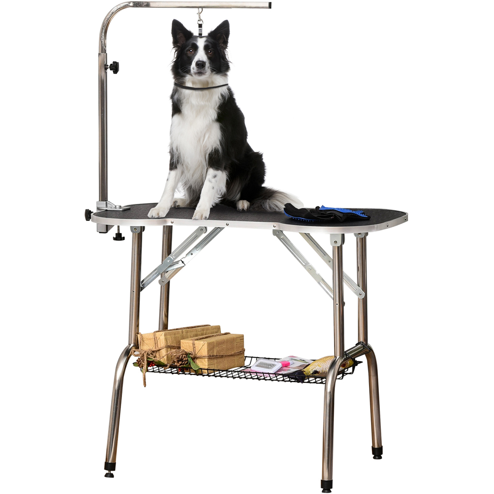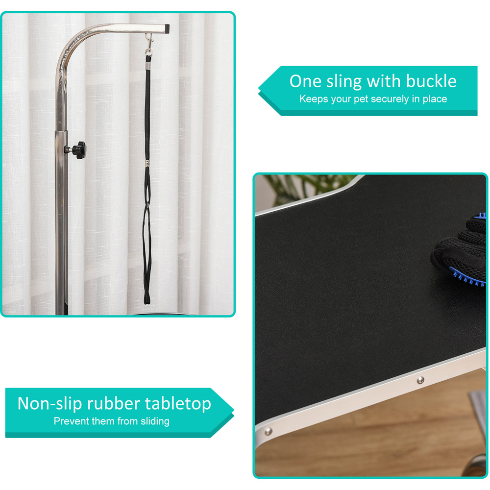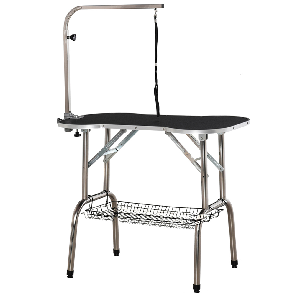 Groom your pet dog with the PawHut Metal Foldable Dog Grooming Table. This table is ideal for washing, trimming fur or grooming them for a fresh new look. It is crafted using a sturdy and foldable metal frame with a dog bone shaped design and an attached leash. The adjustable height allows you to trim, bathe and groom your dog according to your preference. It features a non-slip rubber mat tabletop that keeps your dog steady and comfortable for a long time while grooming. This table also features sturdy feet with anti-slip foot pads for stability and support.