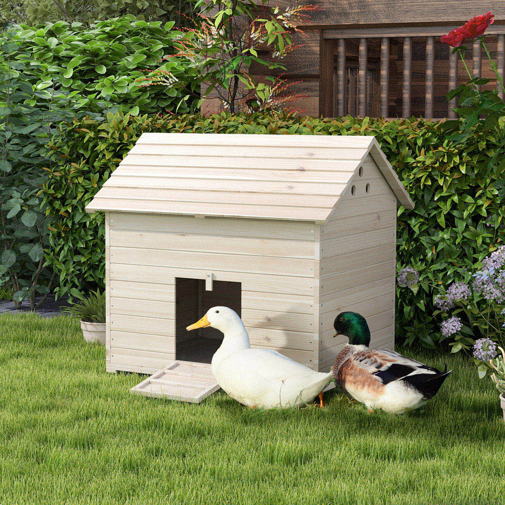 This PawHut pet house is suitable for protecting your small animal. Its fir wood frame makes a robust home, whilst the tilted roof provides shelter – suitable for outdoors. Front door opens as a ramp, so pets can climb up into the house – the openable roof lets you get in and maintain their space, keeping it clean. Holes on the side lets air flow through, whilst its raised base prevents dampness, keeping pets comfortable when inside. An adjustable arm keeps the roof open when needed.