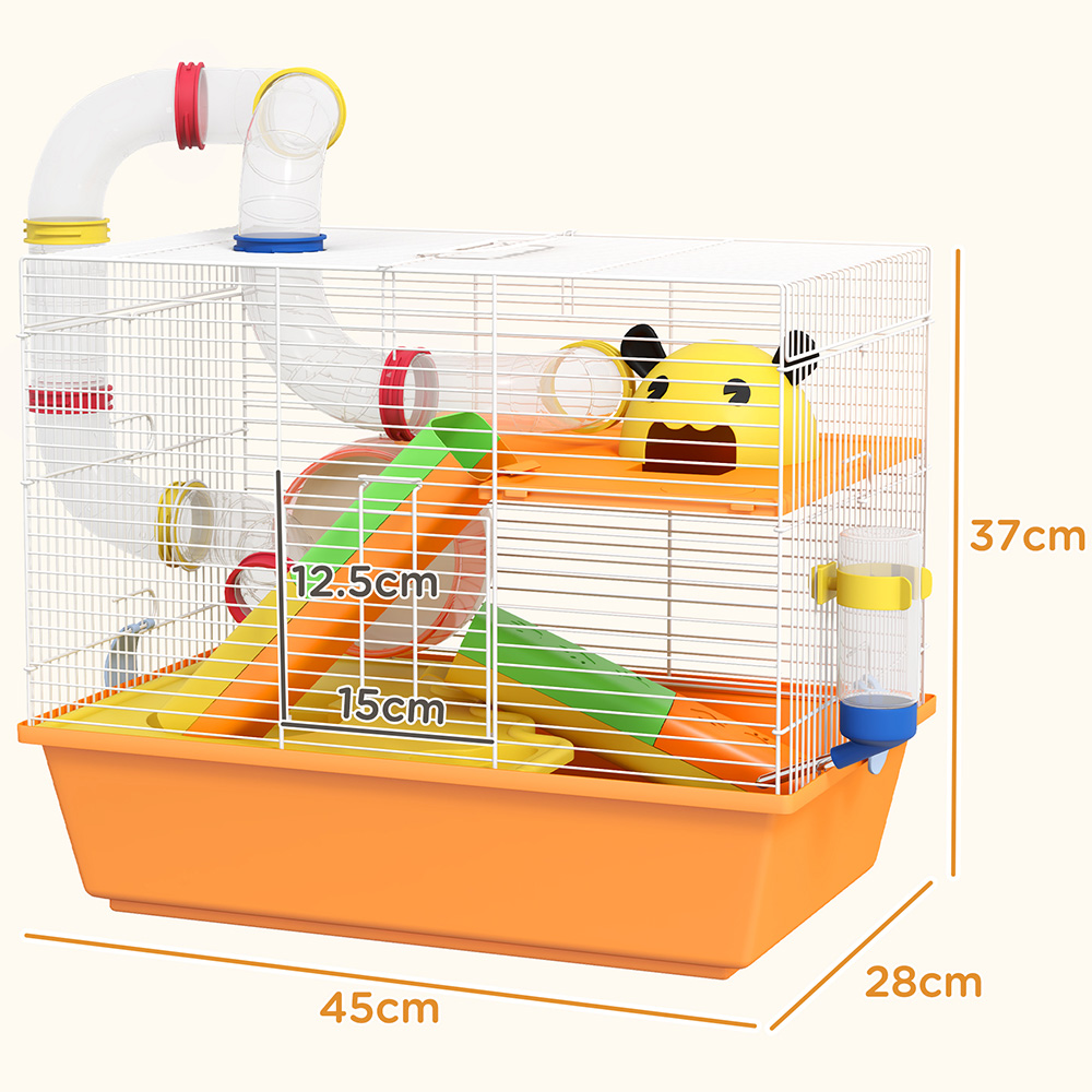 Offer your pet a comfortable and exciting home with the PawHut Orange 3 Tier Dwarf Hamster Cage. Designed for both fun and relaxation, this interactive habitat includes tunnels for endless exploring, a wheel for playful exercise, ramps for climbing, and platforms for rest. A snug hut provides privacy while the includes a food dish and water bottle to keep your pet nourished. The deep bottom and convenient front door make cleaning easy, and the top handle allows for effortless movement.