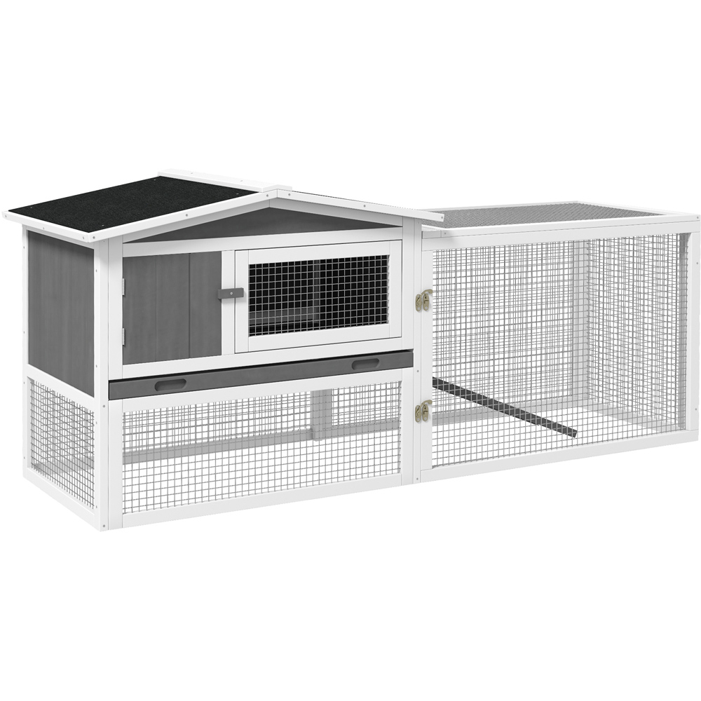 Keep your pets safe and secure with the PawHut Outdoor Pet Rabbit Hutch. They will have a comfortable and safe home with this rabbit house. This hutch provides a spacious home for rabbits, guinea pigs and other small pets. It features a main house with a private and enclosed area where they can rest and sleep. They also have an enclosed outdoor run that is secured with steel wire fencing, keeping them protected while ventilating their space. It also features an easy-to-clean, slide-out tray with multiple doors for simple access, ensuring pets have a hygienic space to flourish. It is finished with a sturdy painted wooden structure with an asphalt roof that shelters the hutch area from hot and wet weather. Size: 68 x 156 x 58cm. Please note: Rabbits need regular and frequent opportunities to exercise. Make sure your rabbits have opportunities to exercise every day to stay fit and healthy. Rabbits are most active in the early morning, late afternoon, and overnight, so every effort should be made to ensure rabbits have access to a large area to exercise at these times. The hutch provides shelter, while rabbits should additionally be provided with a large living enclosure.