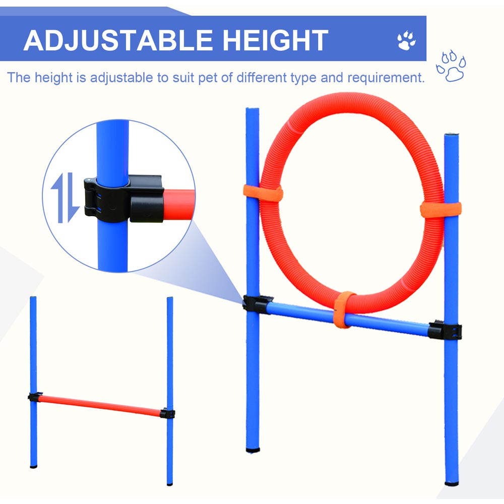This pet agility training set by Pawhut is an excellent piece of equipment to train your pet. This is a great tool to use from your pets early age to create the bond between owner and animal. This will provide a comfortable and happy experience for both. It comes with a long sturdy spike to secure into the ground. It also has an adjustable height of the high jump and a bag is provided for Portable packaging. Includes: Eight steel stakes, two spikes, a string and a bag.