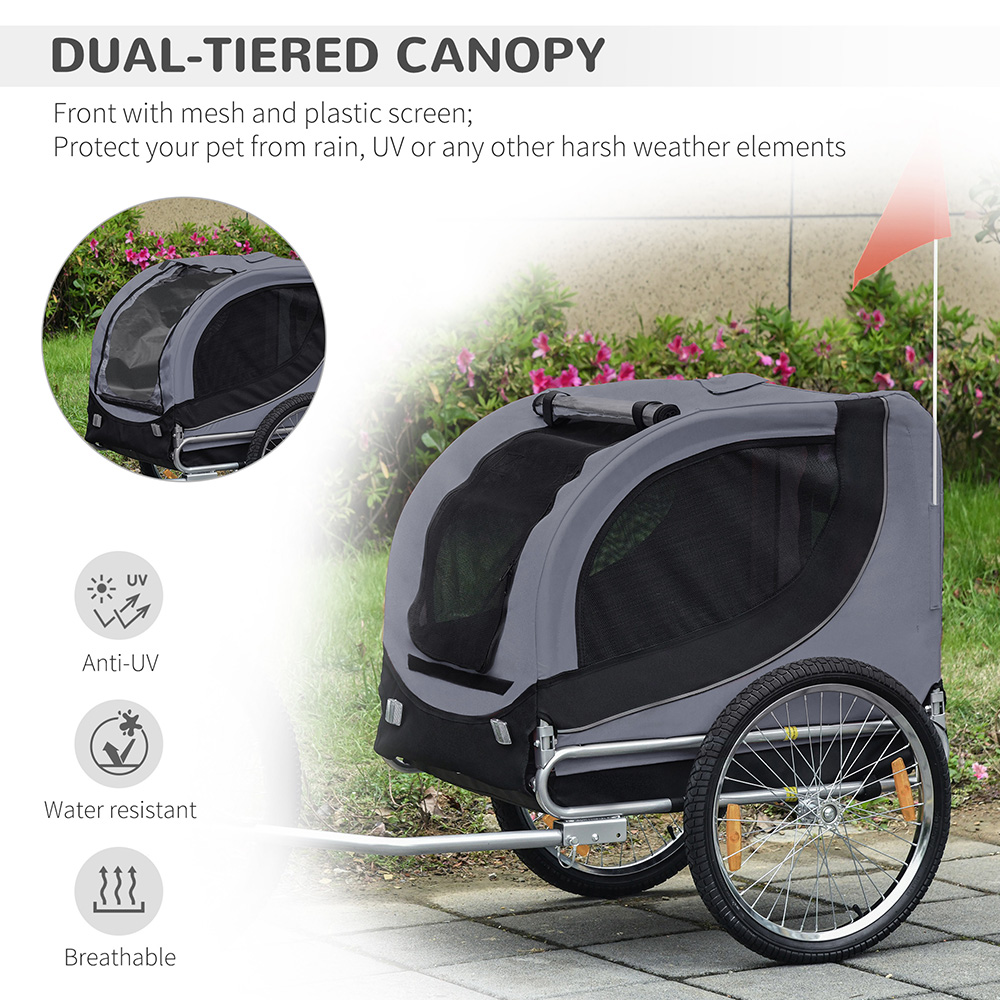 Let your pets enjoy an outdoor ride with the PawHut Pet Bike Trailer. This grey dog bicycle trailer is ideal for small dogs and pets who find it hard to walk around. It can be easily attached to your bike and includes an internal safety anchor for belt attachment. It is crafted using a solid steel frame with a strong and reliable structure while riding on the roads. It features a spacious compartment made from Oxford fabric with a PU cover for light weather resistance. The mesh windows with front-zip fastenings for easy access enhance the air circulation. The sturdy reflectors, a flag for visibility in the dark with a steady attached grip and the durable wheels offer a smooth ride for pets.